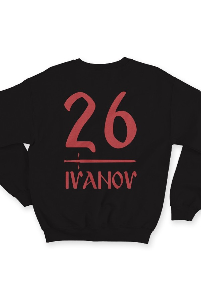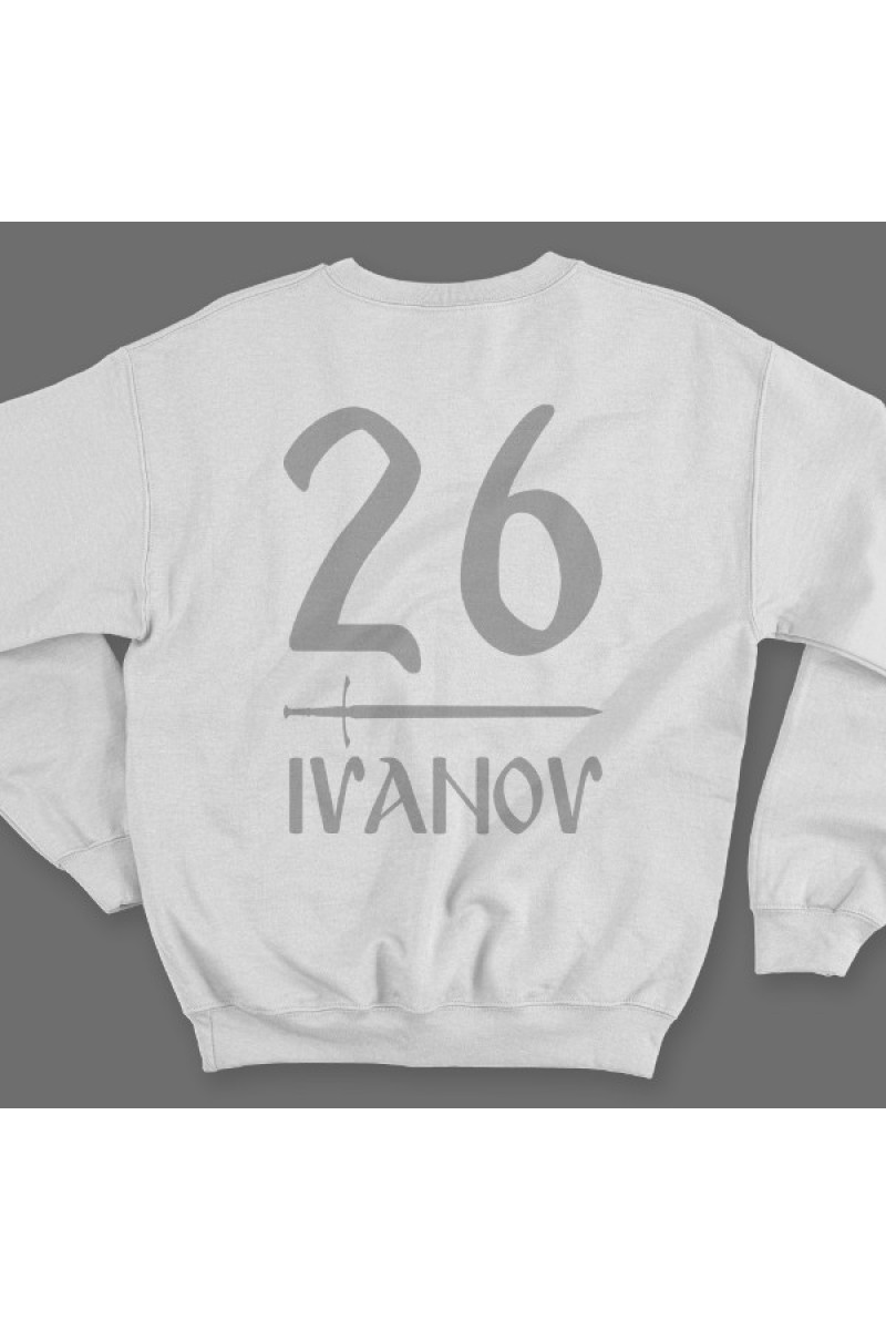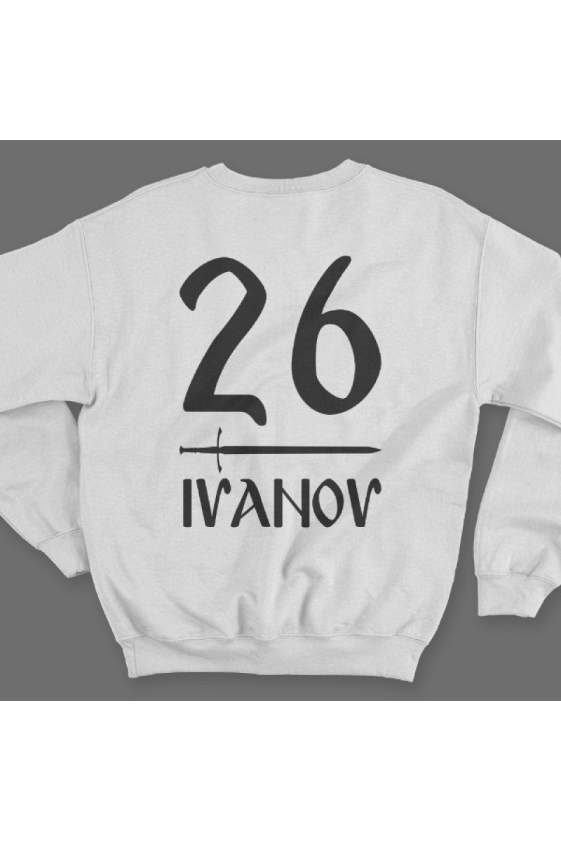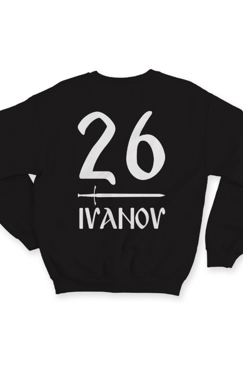 Именной свитшот со славянским шрифтом. Помимо надписи на свитшоте есть изображение меча.