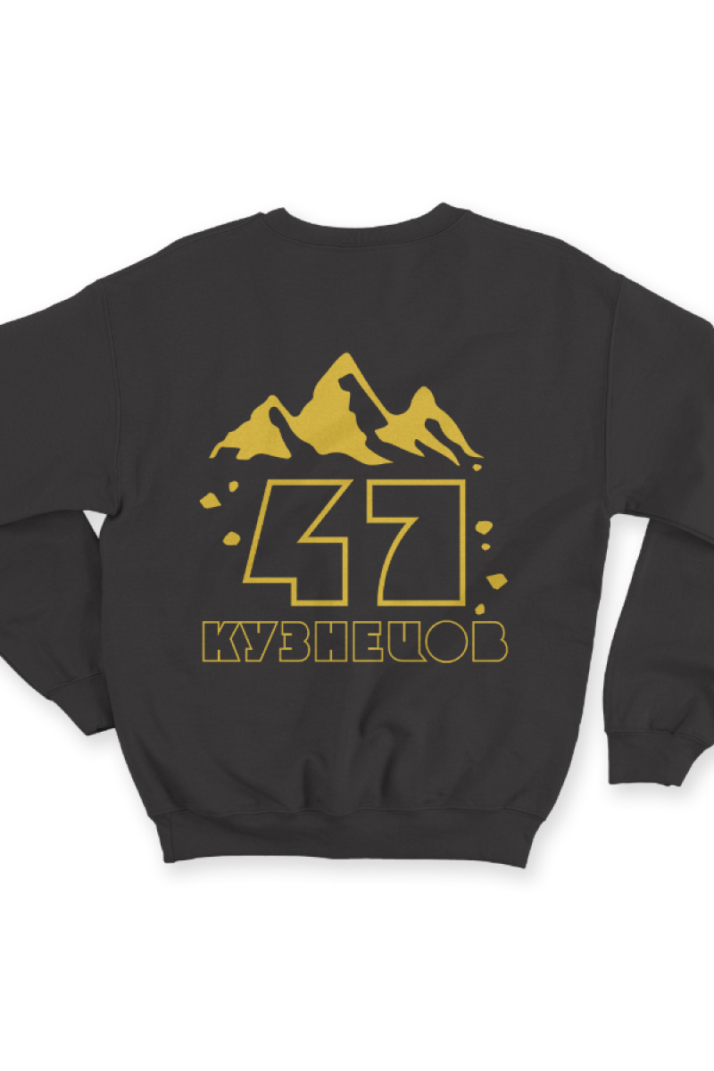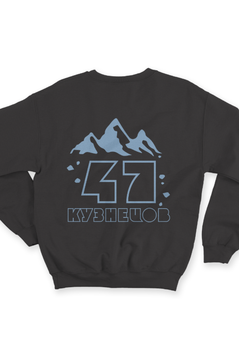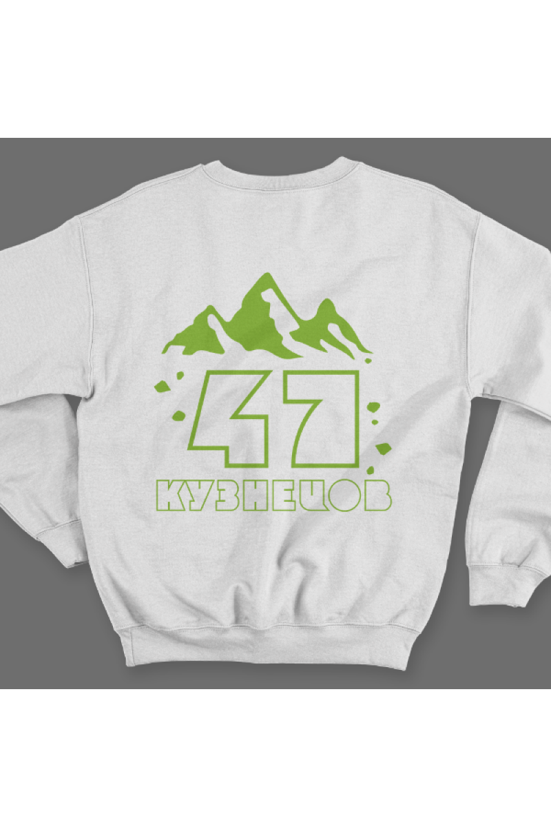 Веселый именной свитшот с необычным шрифтом. Помимо надписи на свитшоте есть изображение гор.