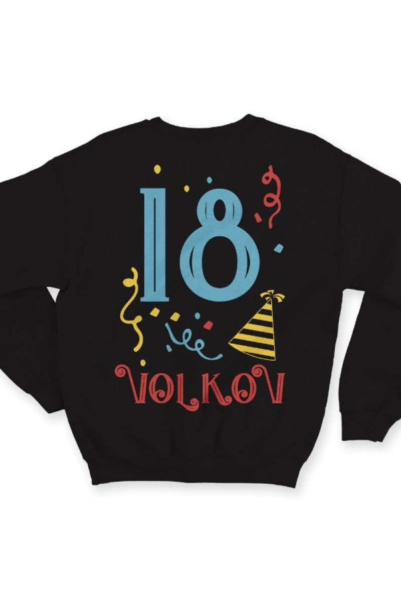 Веселый именной свитшот с праздничным шрифтом. Помимо надписи на свитшоте есть изображение колпака и конфетти.
