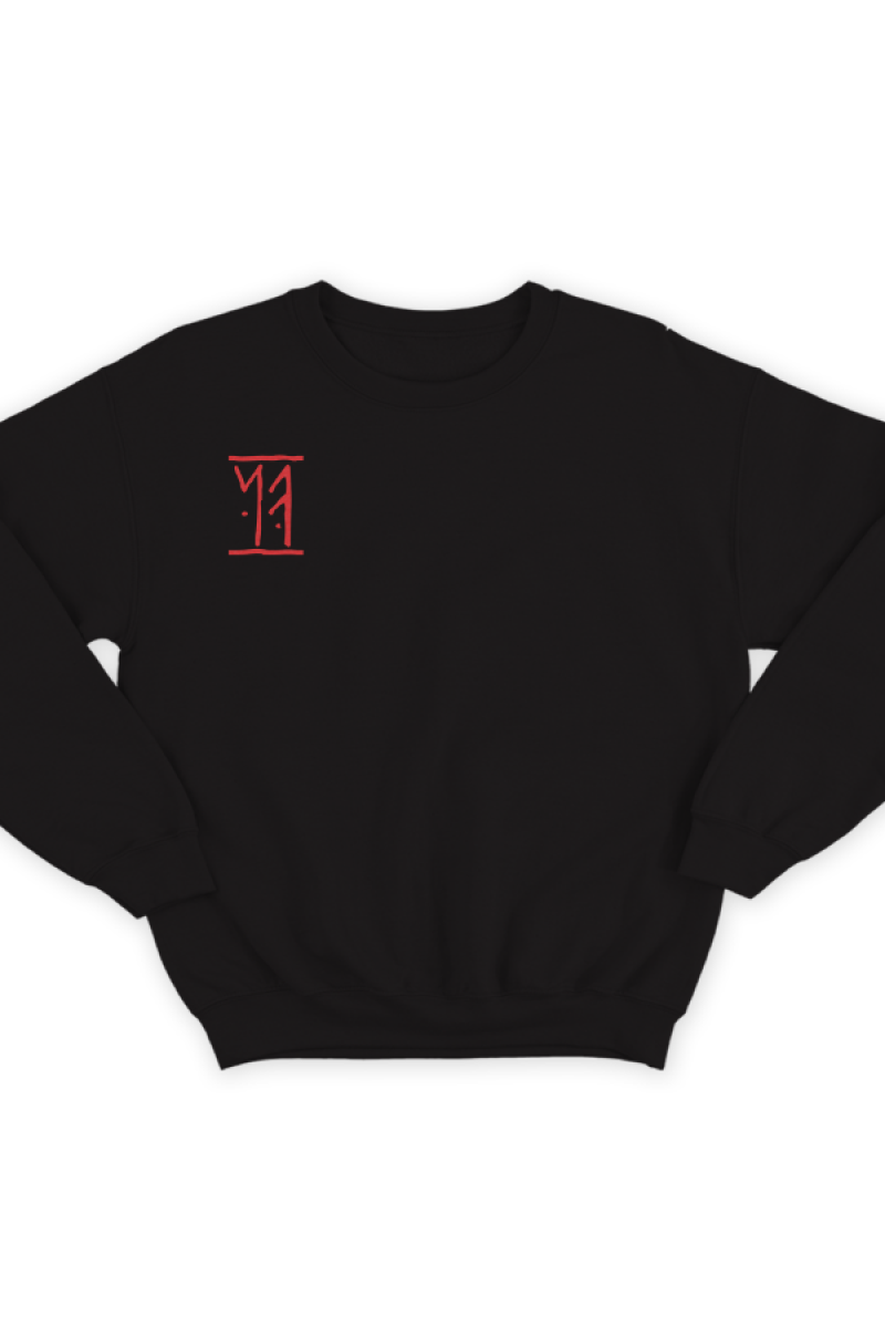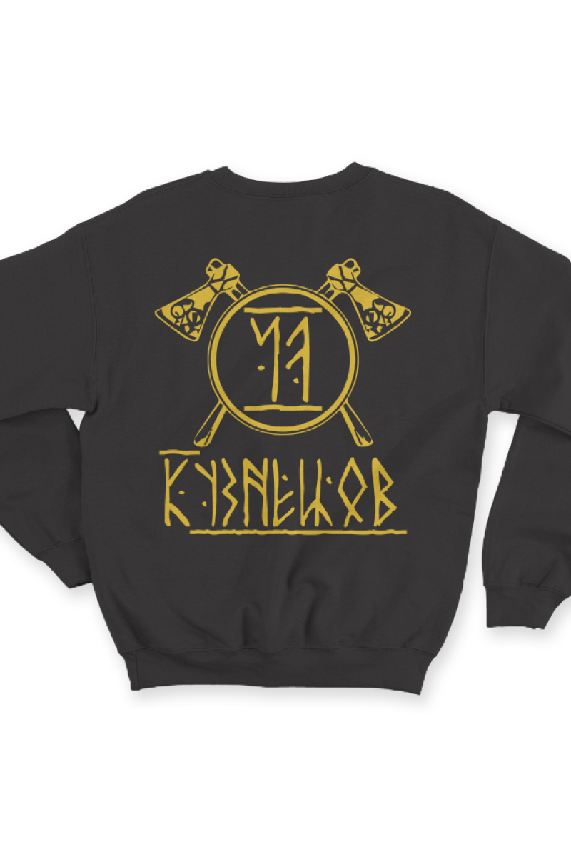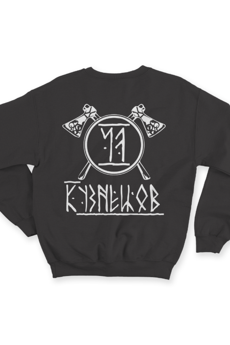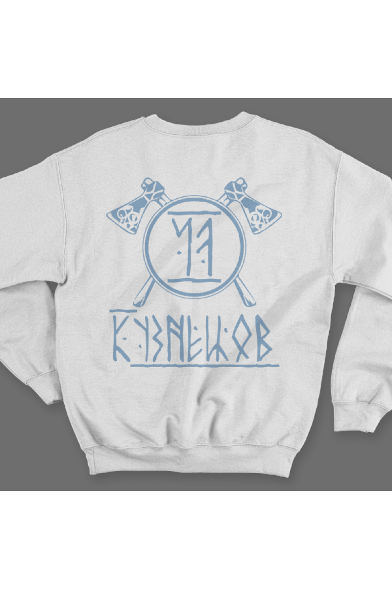Веселый именной свитшот с руническим шрифтом. Помимо надписи на свитшоте есть изображение топоров и щита.