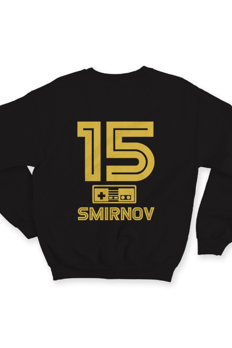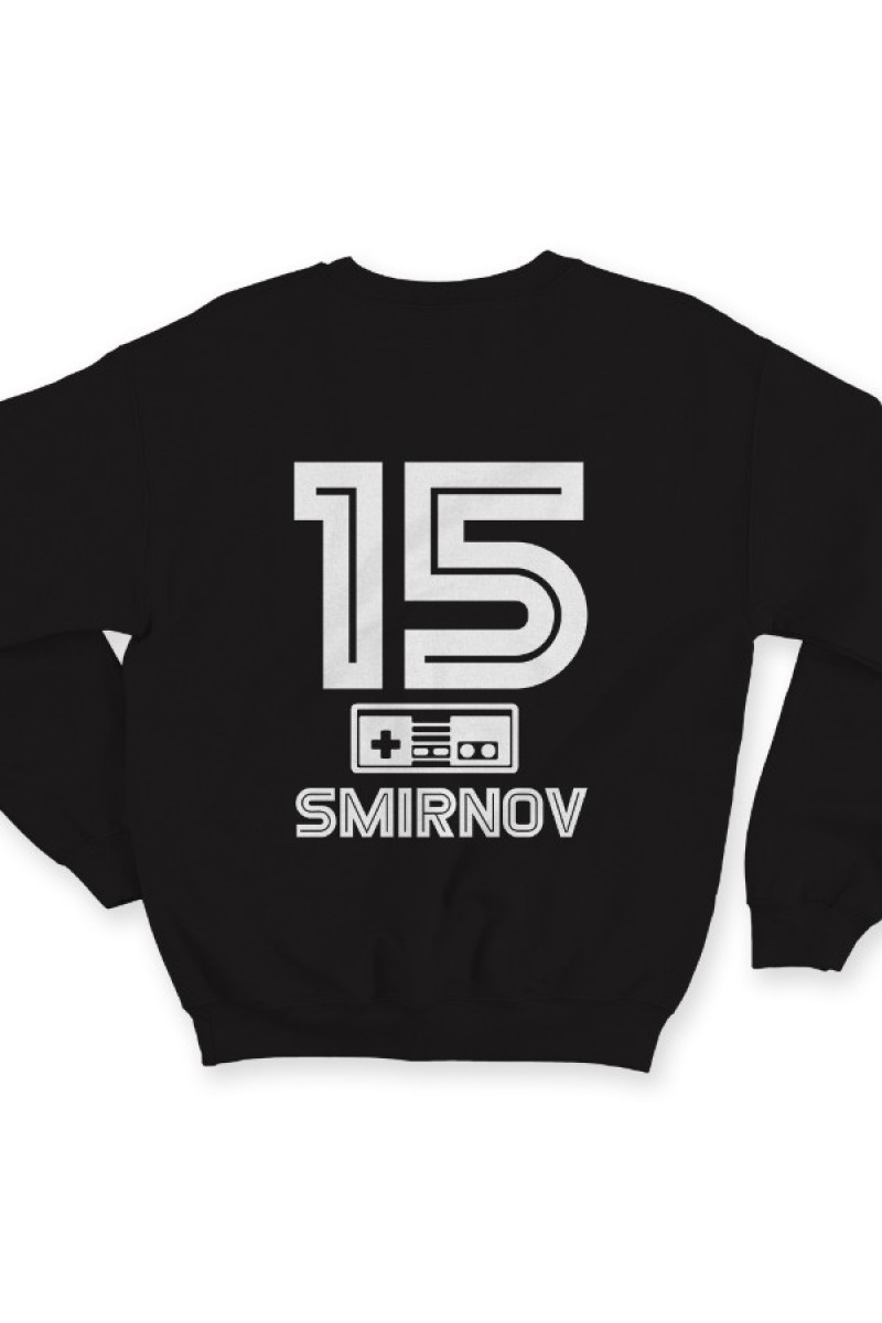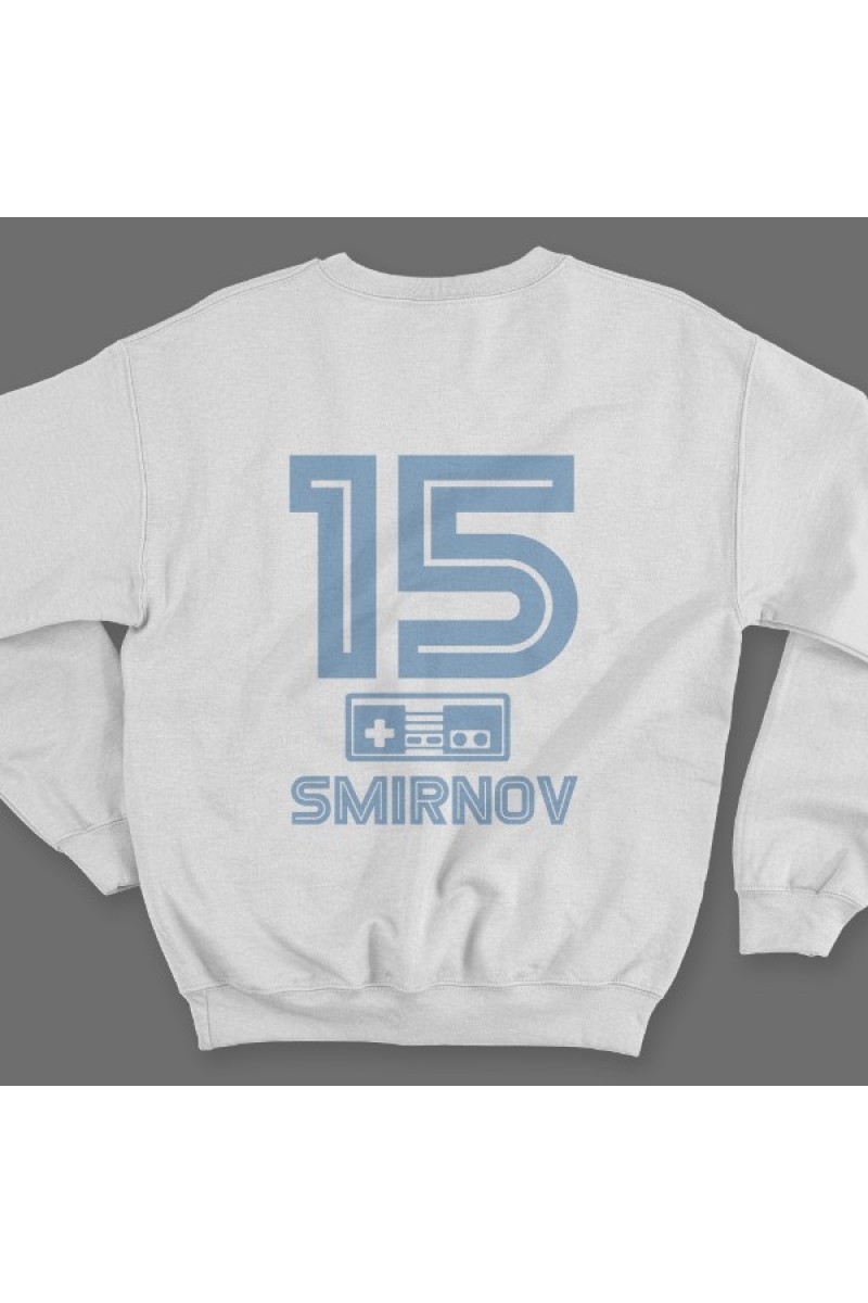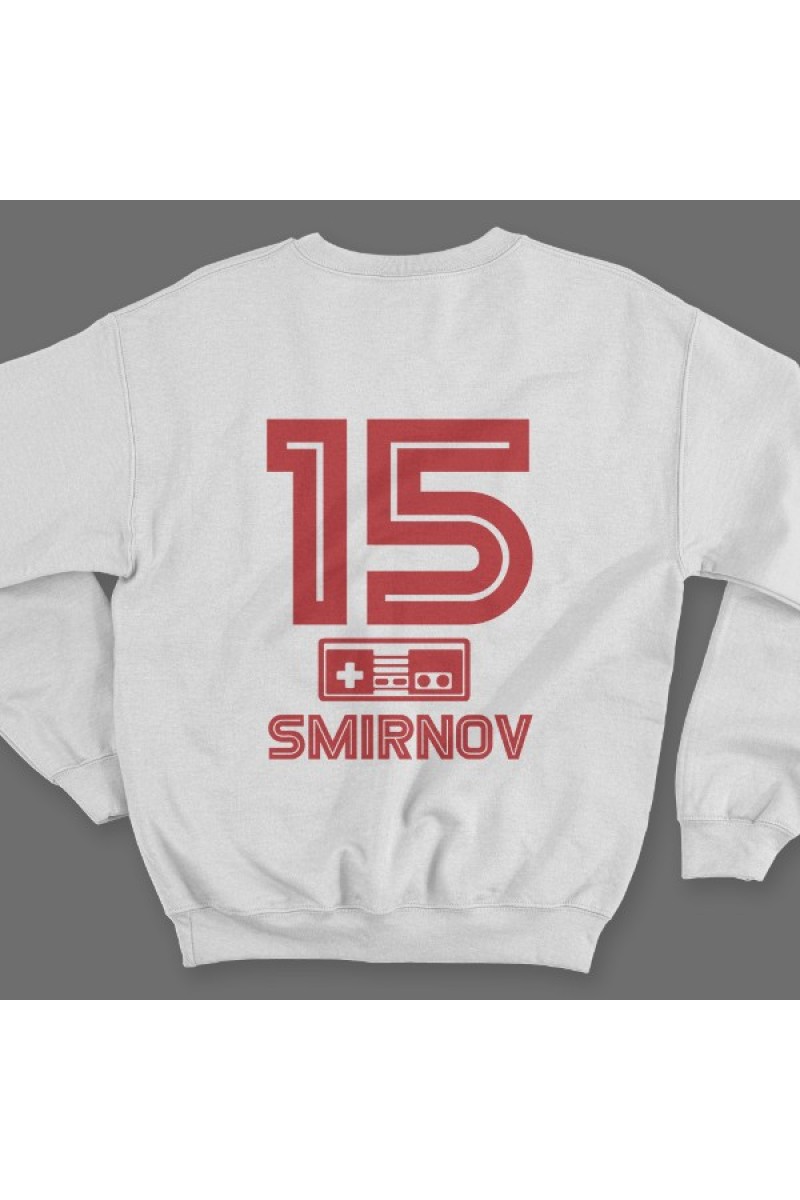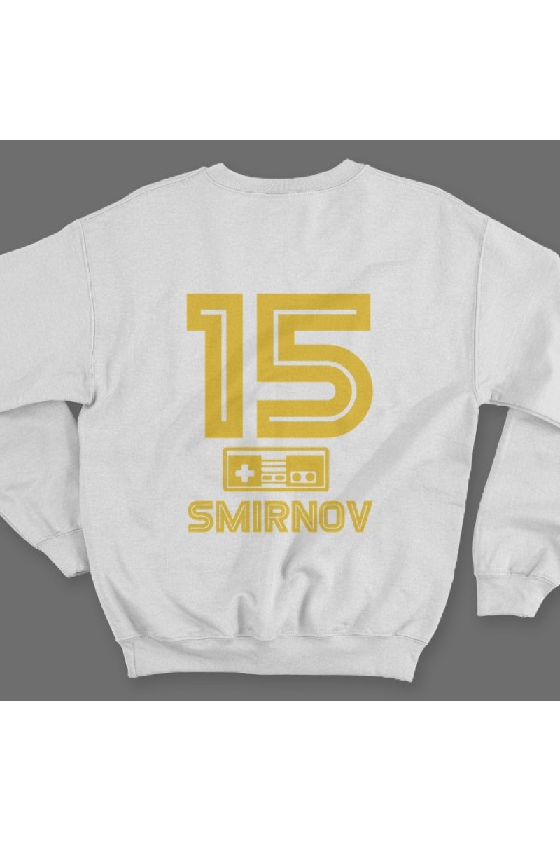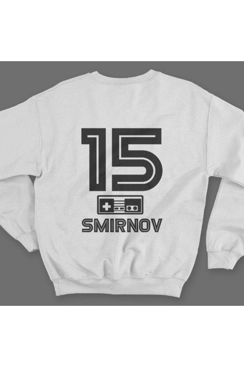 Веселый именной свитшот с шрифтом из игр Nintendo. Помимо надписи на свитшоте есть изображение джойстика.