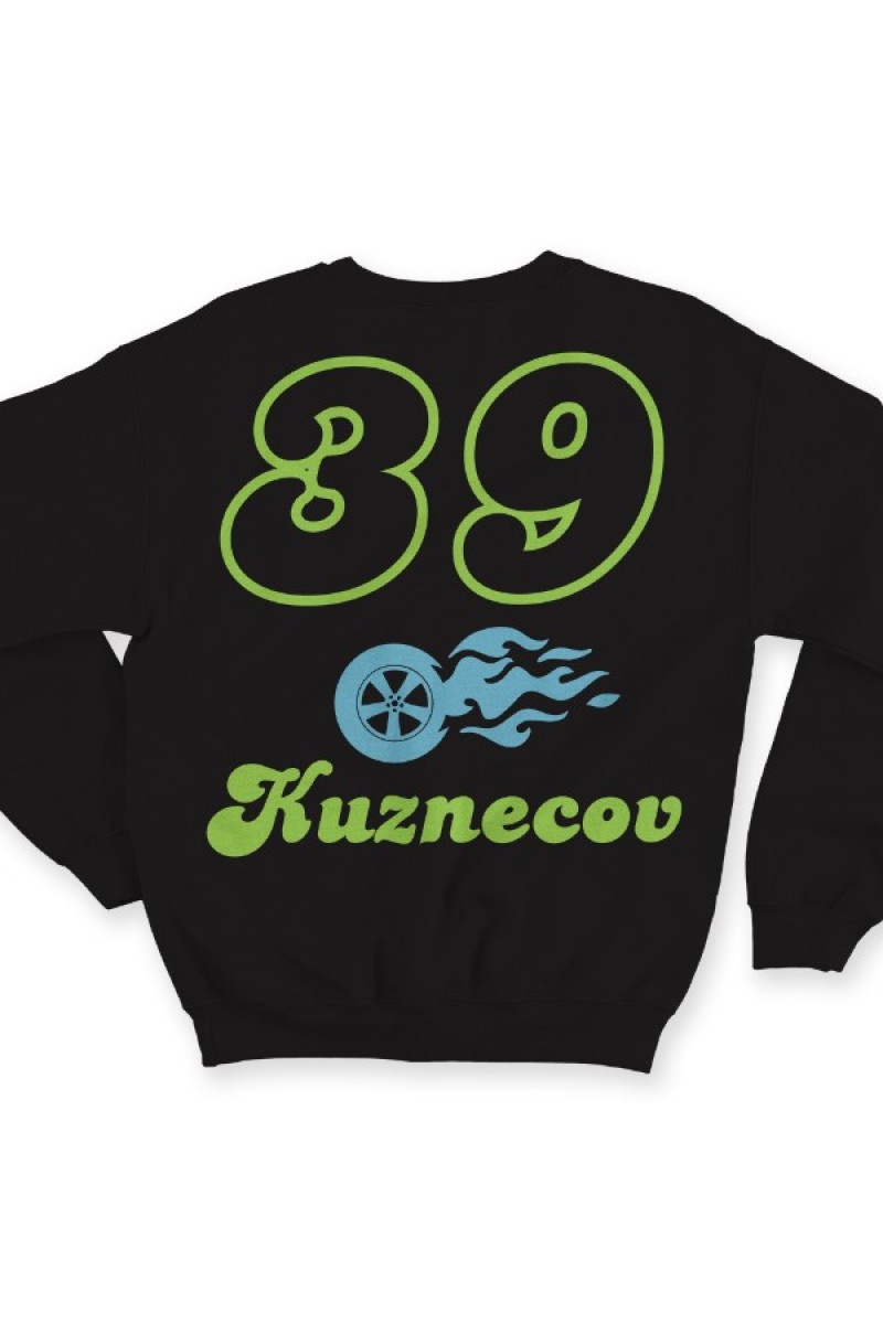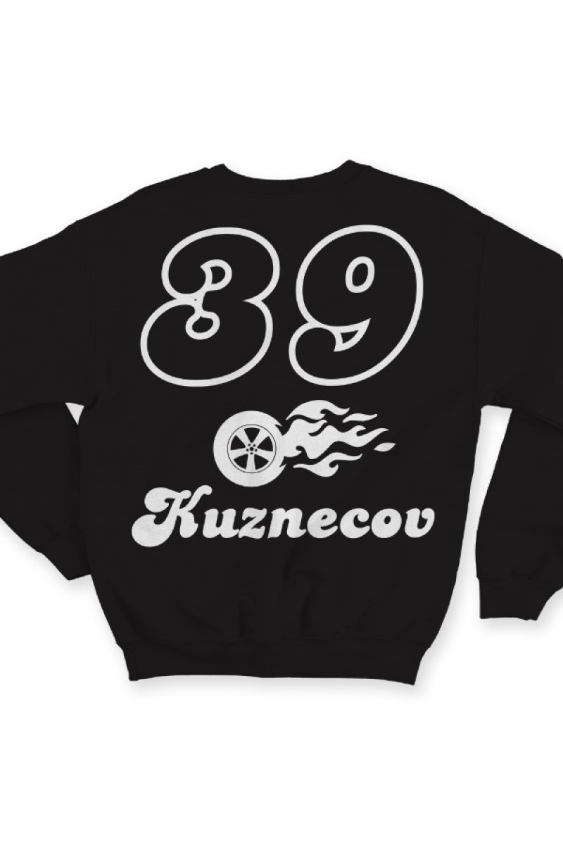 Веселый именной свитшот с шрифтом из нулевых. Помимо надписи на свитшоте есть изображение колеса в огне.
