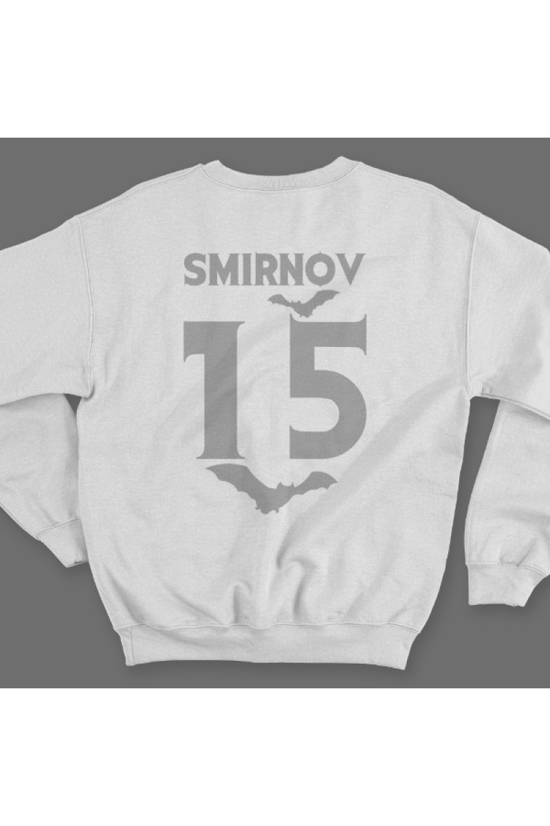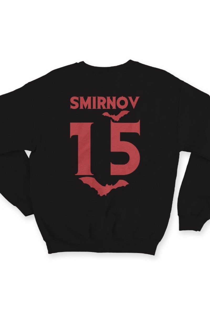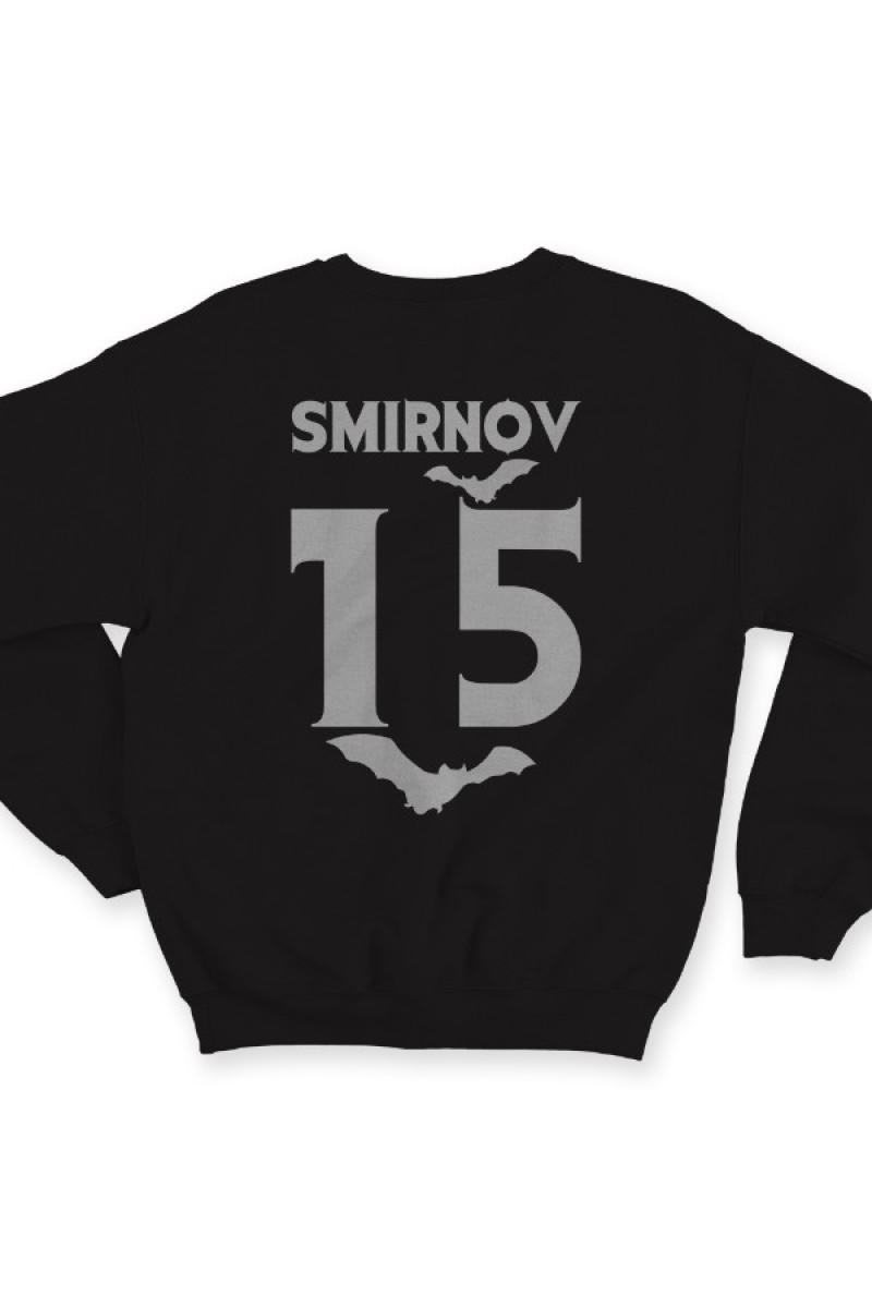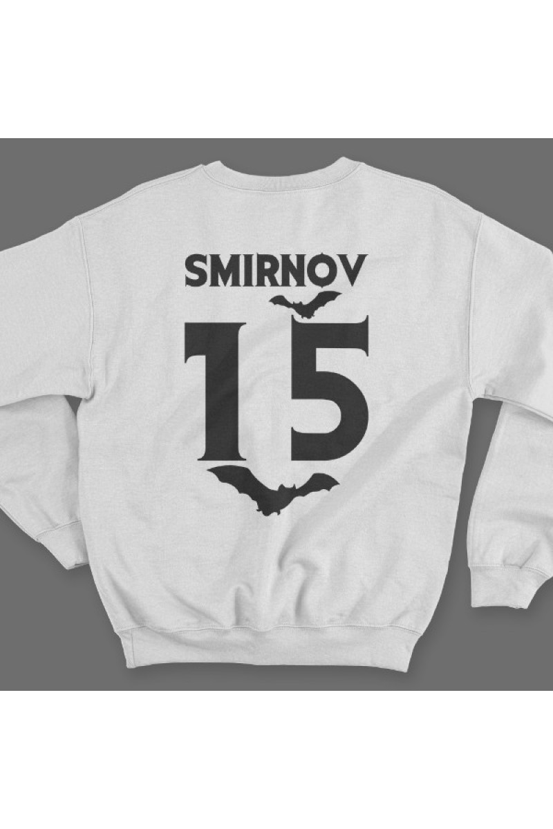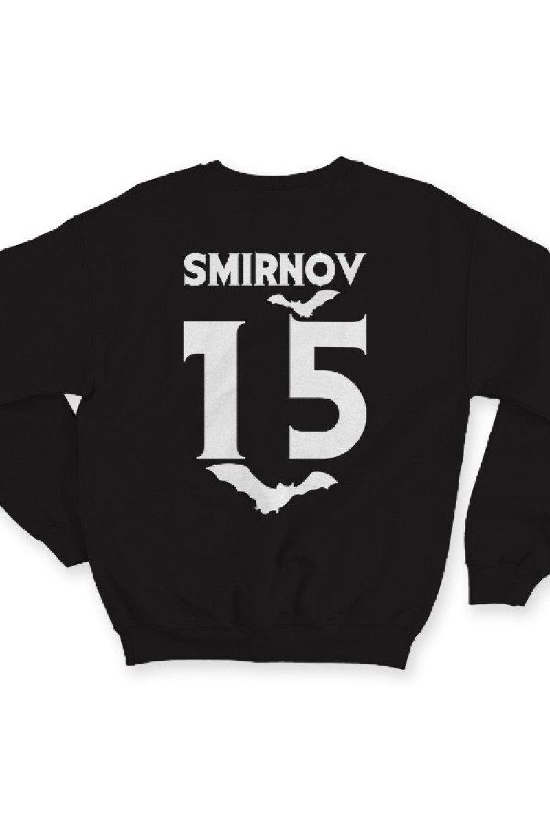 Веселая именной свитшот с вампирским шрифтом. Помимо надписи на свитшоте есть изображение летучих мышей.