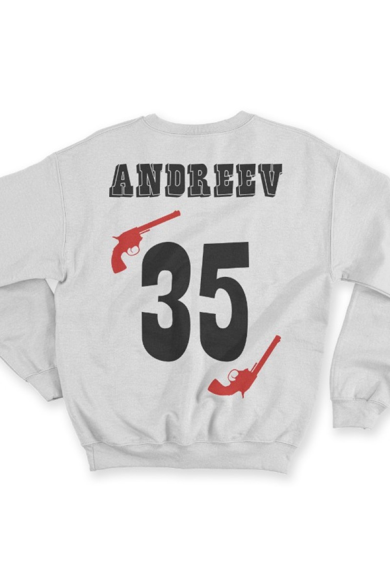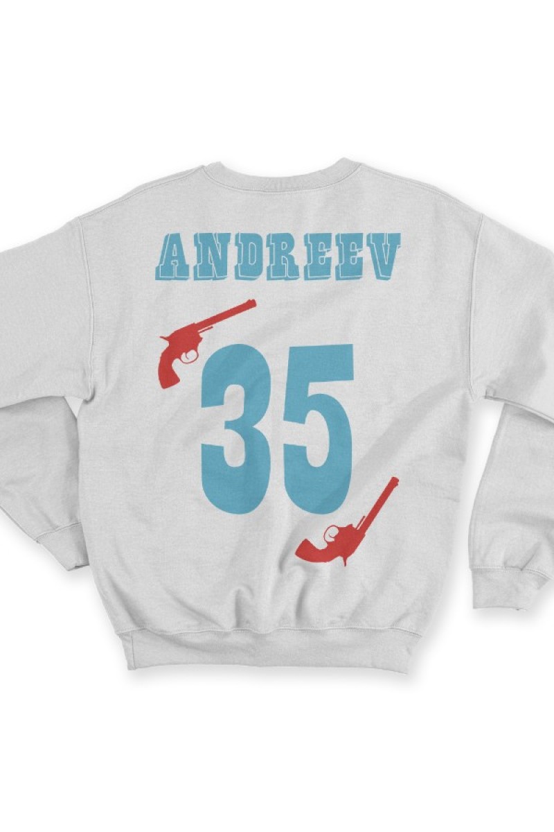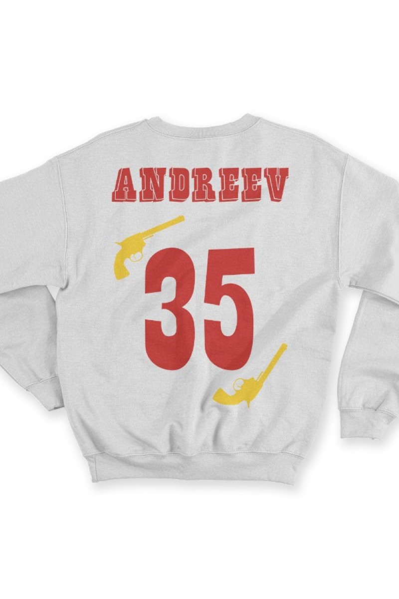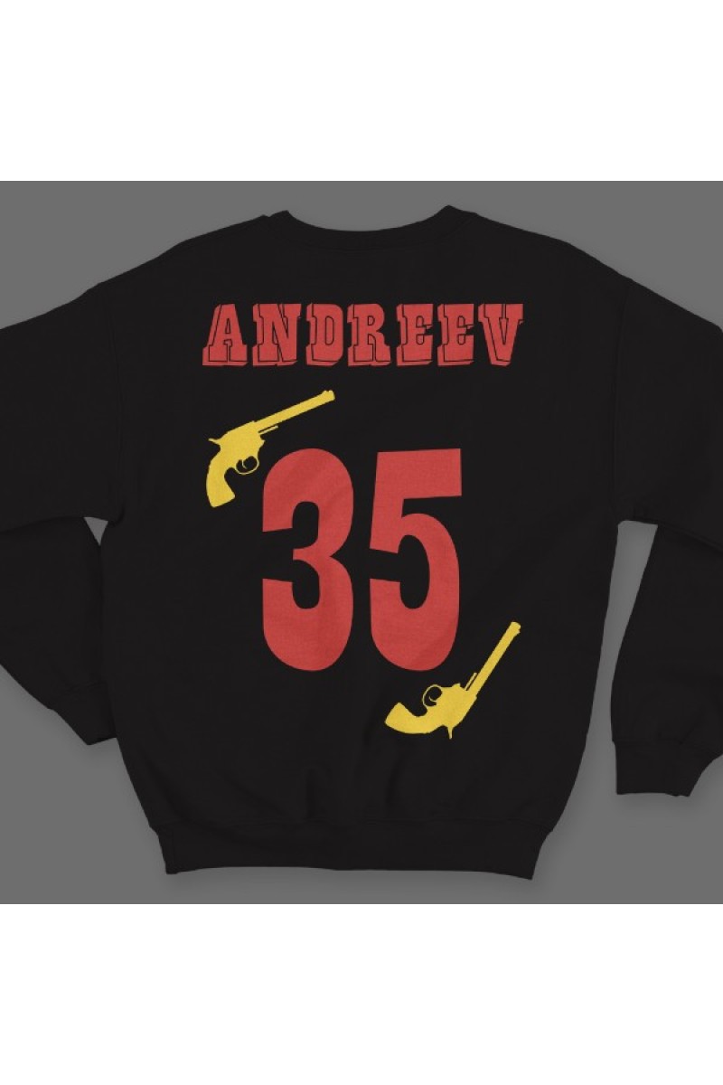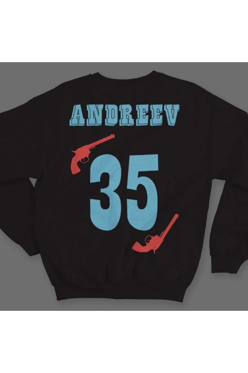 Веселый именной свитшот с вестерн шрифтом. Помимо надписи на свитшоте есть изображение револьверов.