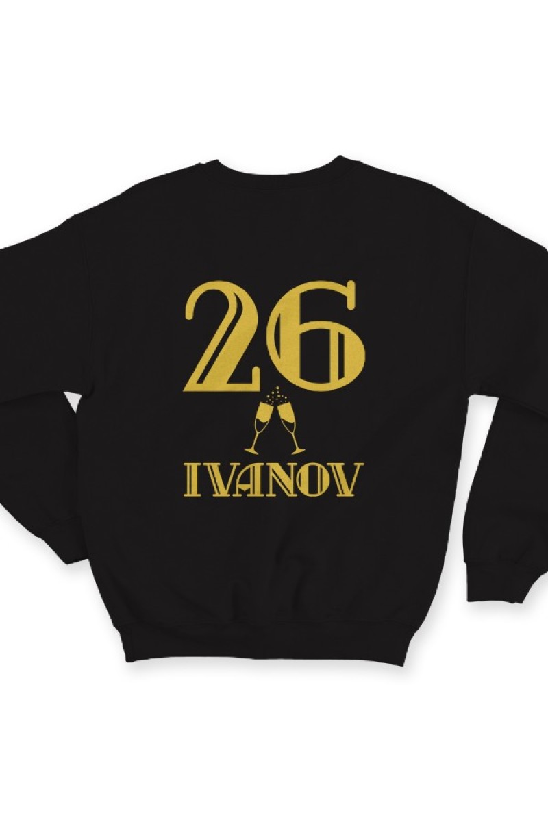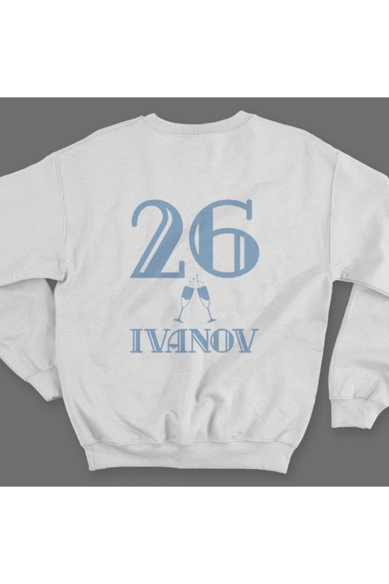 Именной свитшот с винтажным шрифтом. Помимо надписи на свитшоте есть изображение бокалов шампанского.