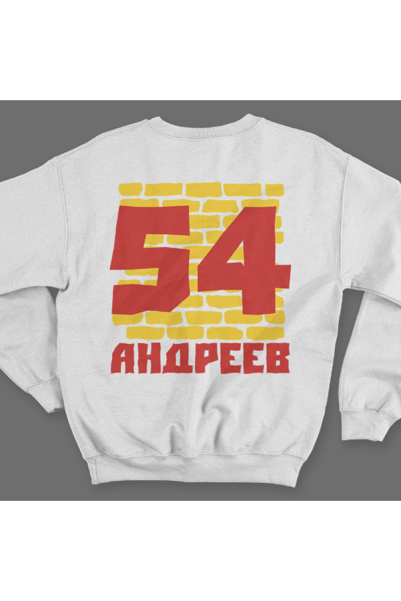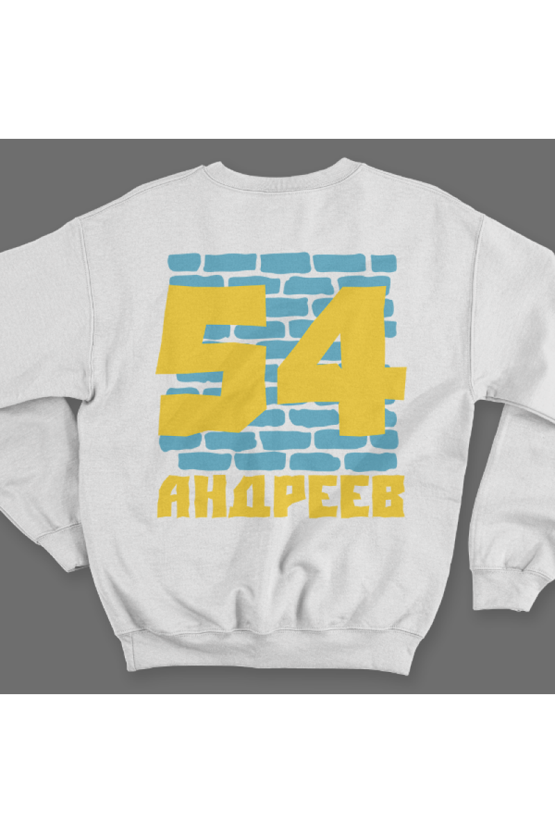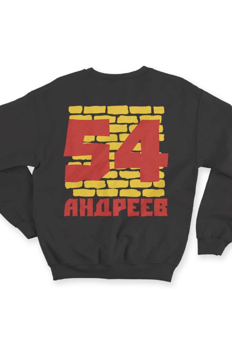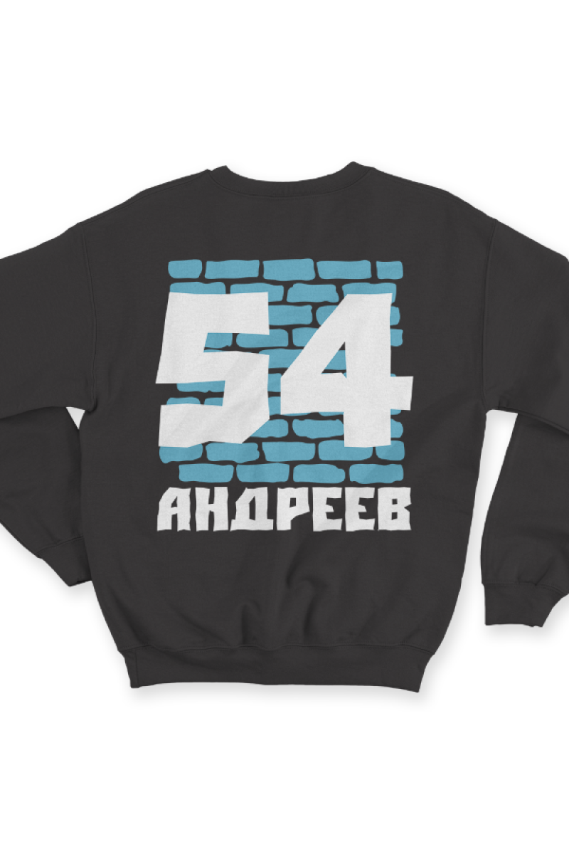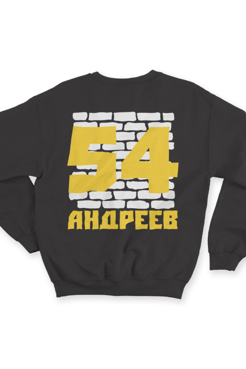 Веселый именной свитшот с жирным шрифтом. Помимо надписи на свитшоте есть изображение кирпичной стены.
