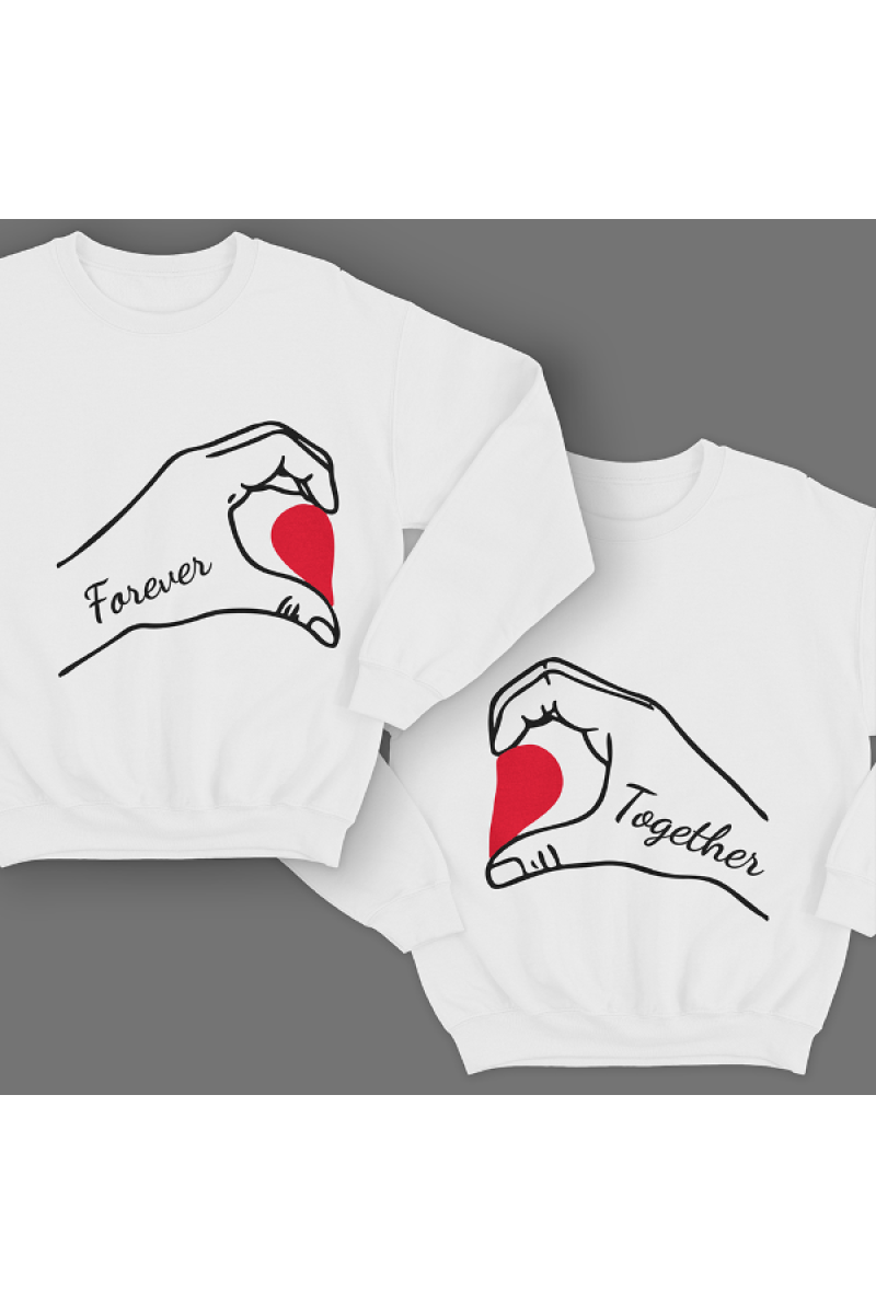 Парные свитшоты для молодоженов с надписями "Forever together" (Вместе навсегда). Помимо надписей на принте изображены руки соединяющие сердце.