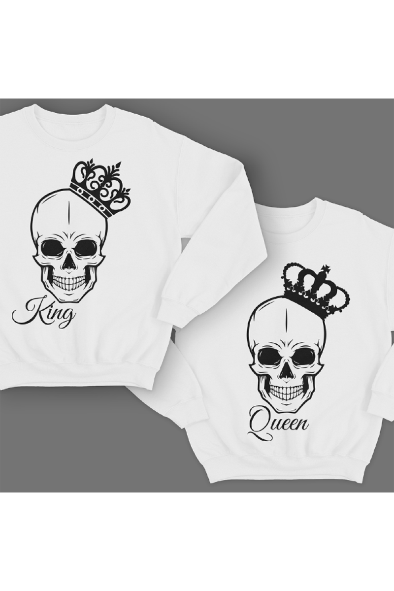 Парные свитшоты для молодоженов с надписями "Queen" (Королева) - для нее и "King" (Король) - для него. Помимо надписей на принте изображены черепа с коронами.