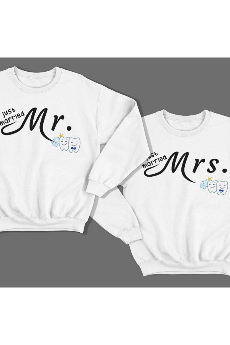 Парные свитшоты для молодоженов. На мужской толстовке надпись "Mr.", а на женской "Mrs.". На каждой толстовке есть надпись "Just married" означающая "Молодожены" и уникальная иллюстрация обручившихся зубиков.