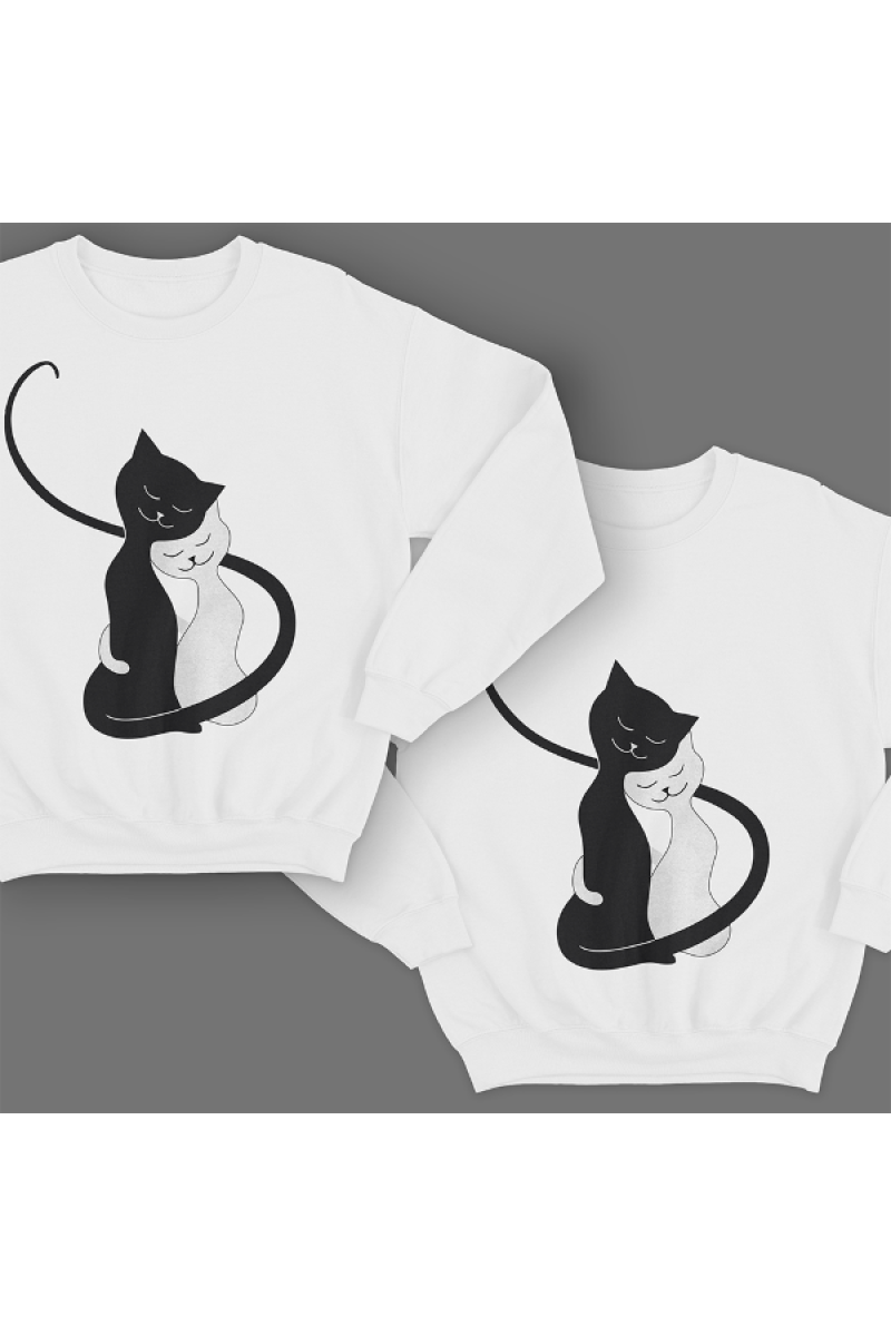 Парные свитшоты для молодоженов с милыми принтами обнимающихся котиков.