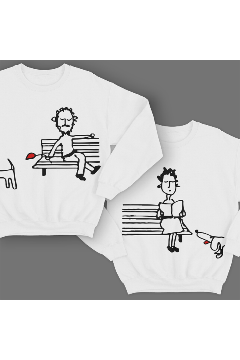 Парные свитшоты для молодоженов с принтом на котором изображены мужчина и женщина сидящие на скамейке, а рядом с ними гуляет собачка.