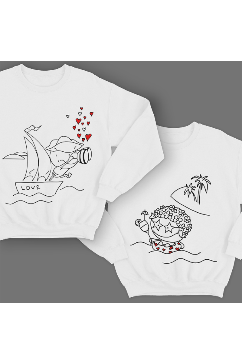 Парные свитшоты для молодоженов с принтом на котором изображен пират подглядывающий за отдыхающей туристкой.