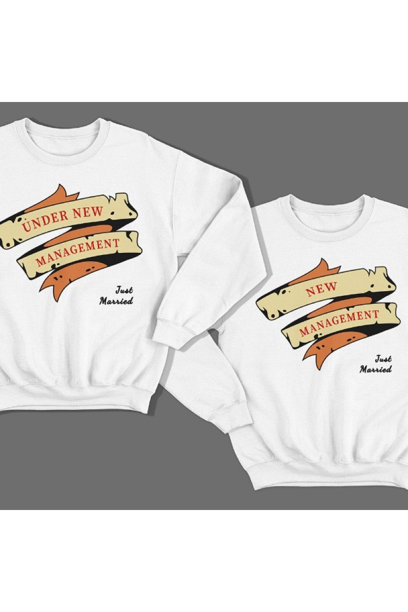 Парные свитшоты для молодоженов. На мужской толстовке надпись "У меня новый начальник", а на женской "новый начальник".
