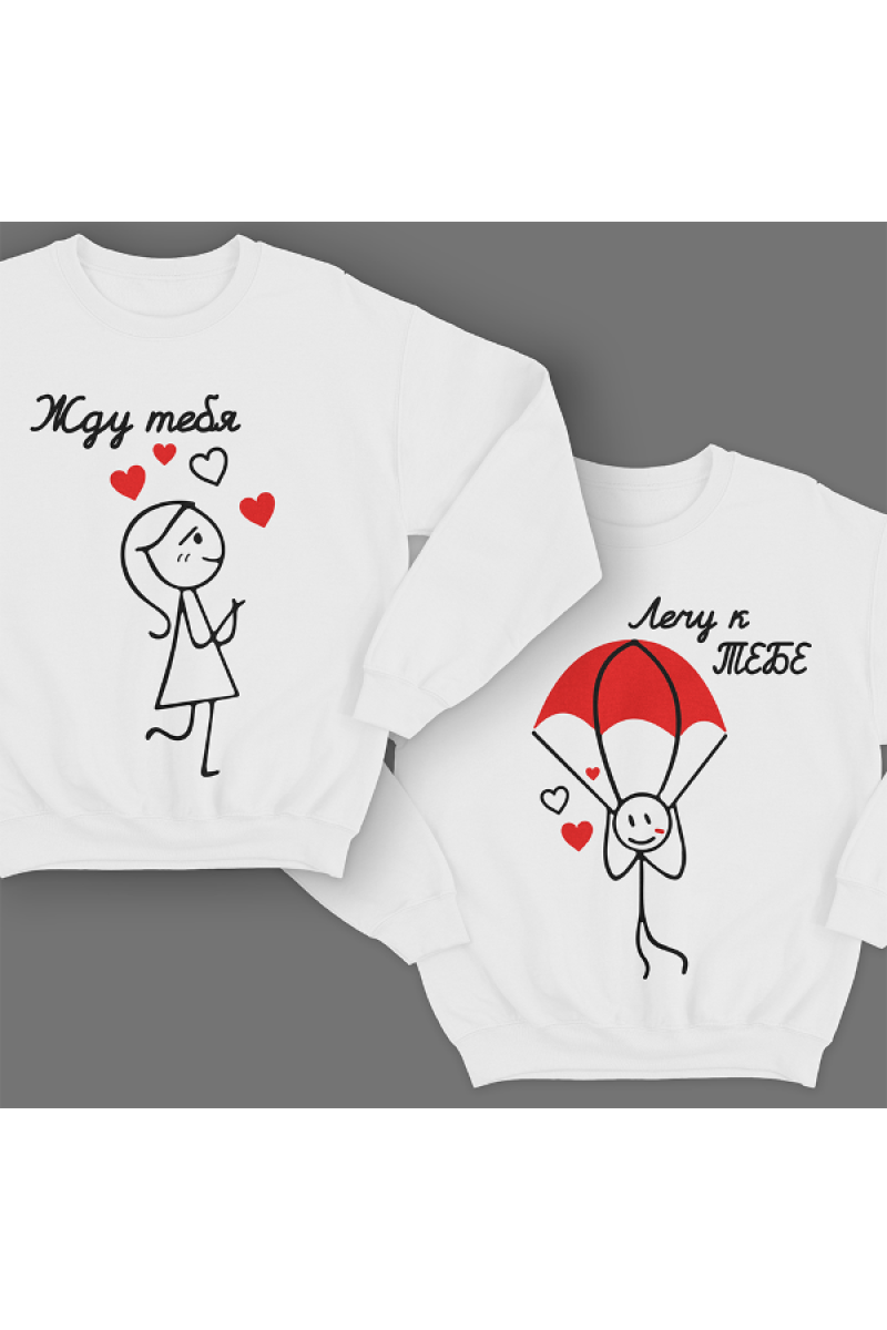 Парные свитшоты для молодоженов с надписями "Жду тебя" - для нее и "Лечу к тебе" - для него. Помимо надписей на принте изображены человечки соответствующие надписям.