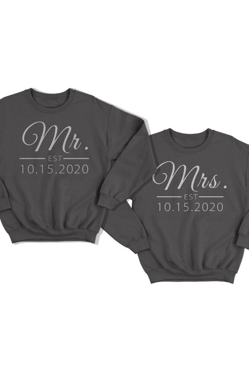 Парные свитшоты для молодоженов. На мужской толстовке надпись "Mr.", а на женской "Mrs.". На каждой толстовке можно выбрать дату начала ваших отношений/помолвки/свадьбы.