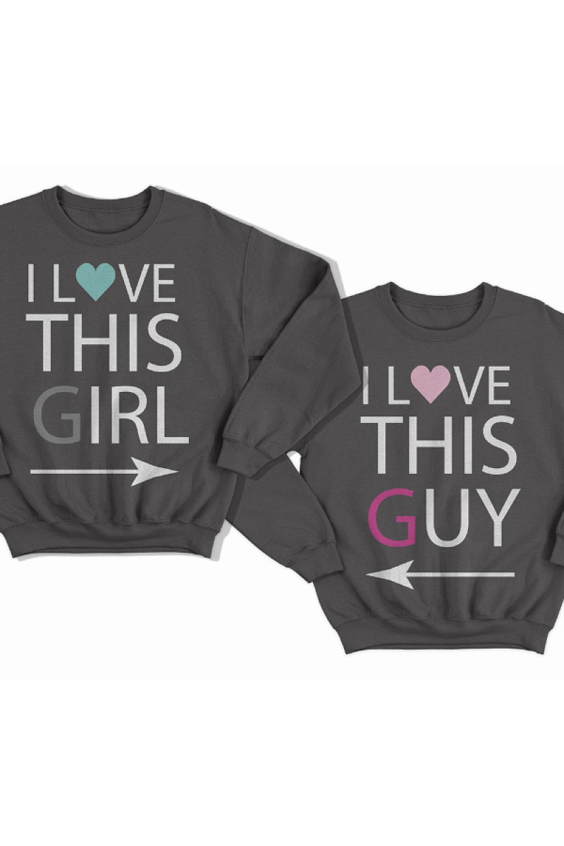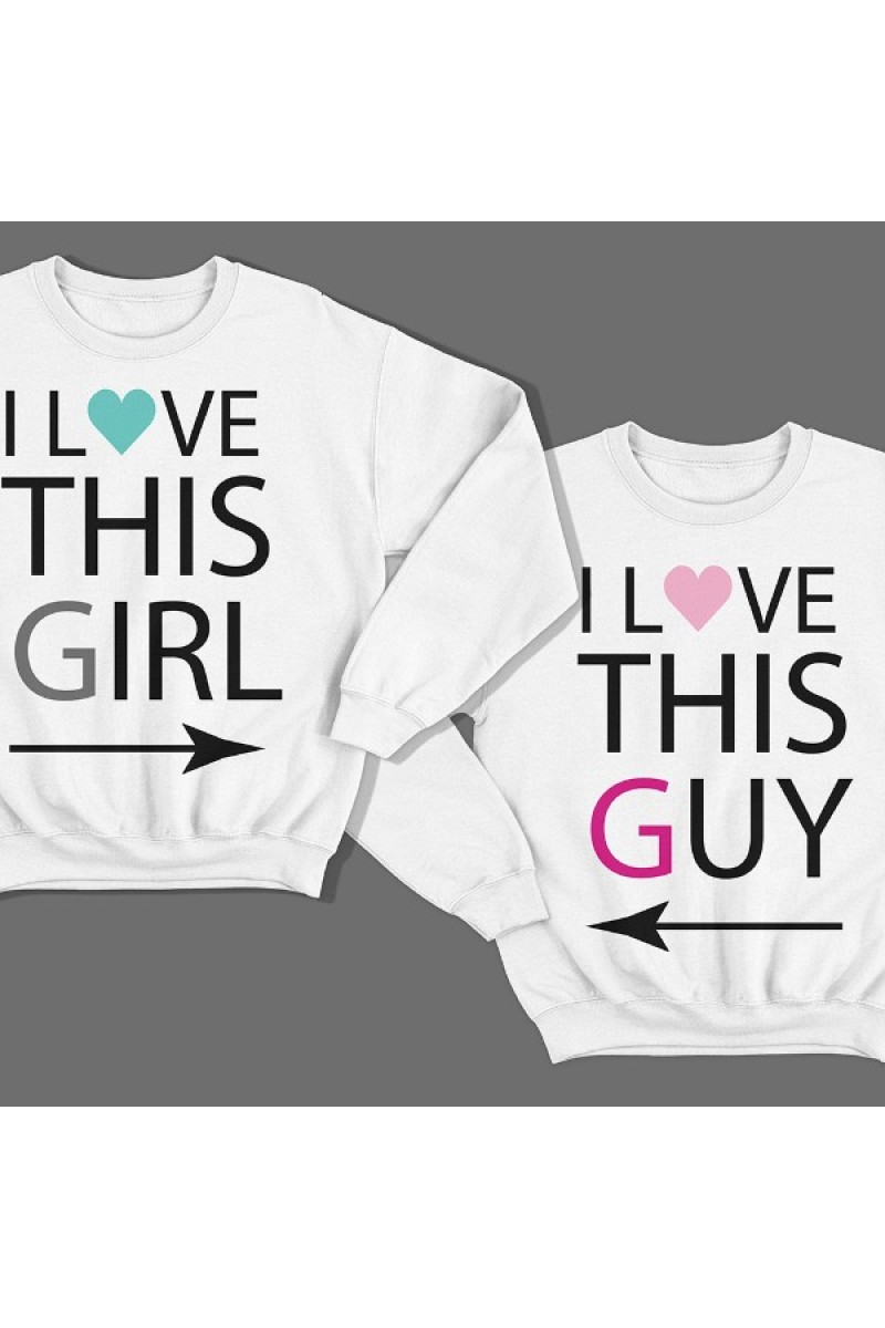 Парные свитшоты для влюбленных с надписями "I LOVE THIS GIRL" ("Я люблю эту девчонку") для него и "I LOVE THIS GUY" ("Я люблю этого парня") для неё. Помимо надписи на принте есть рисунок указывающий на партнера.