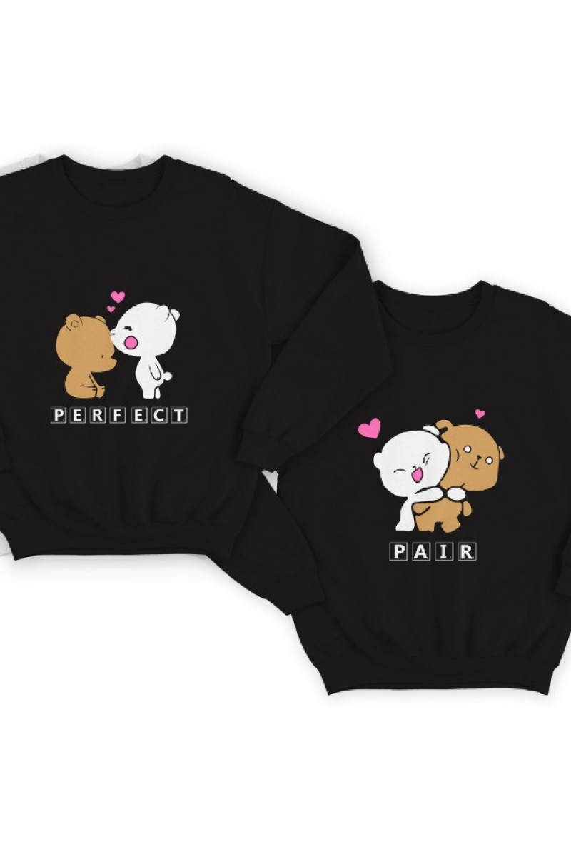 Парные свитшоты для влюбленных с надписями "Perfect" - лучшая и "Pair" - пара. Помимо надписей на принте есть смешные рисунки белого и бурого мишек.