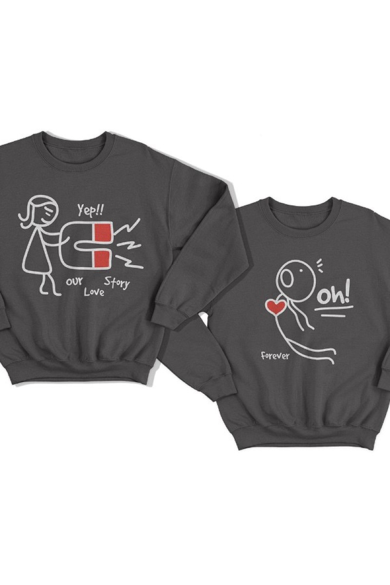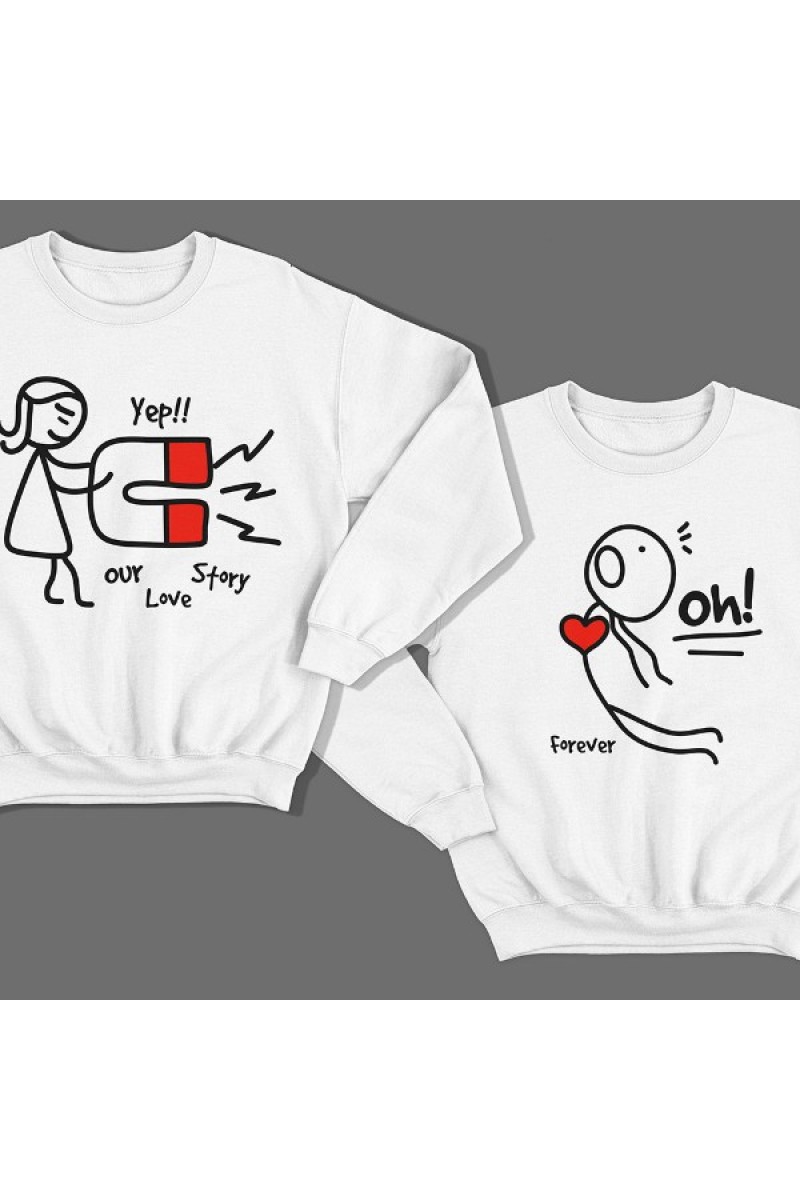Парные свитшоты для влюбленных с смешными человечками. Надпись на женской - "Our love story" ("История нашей любви").