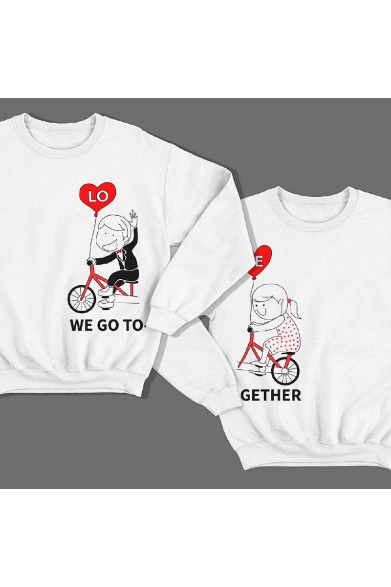 Парные свитшоты для влюбленных с надписями "We go" ("мы едем") для него и "Together" ("вместе") для неё. Помимо надписи на принте есть изображения мальчика и девочки, которые едут на одном велосипеде вместе.
