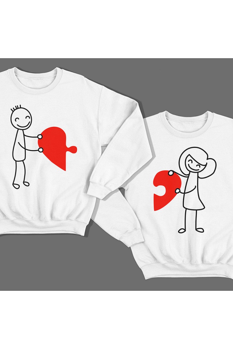 Парные свитшоты для влюбленных с изображениями мальчика и девочки, которые соединяют сердце-пазл.