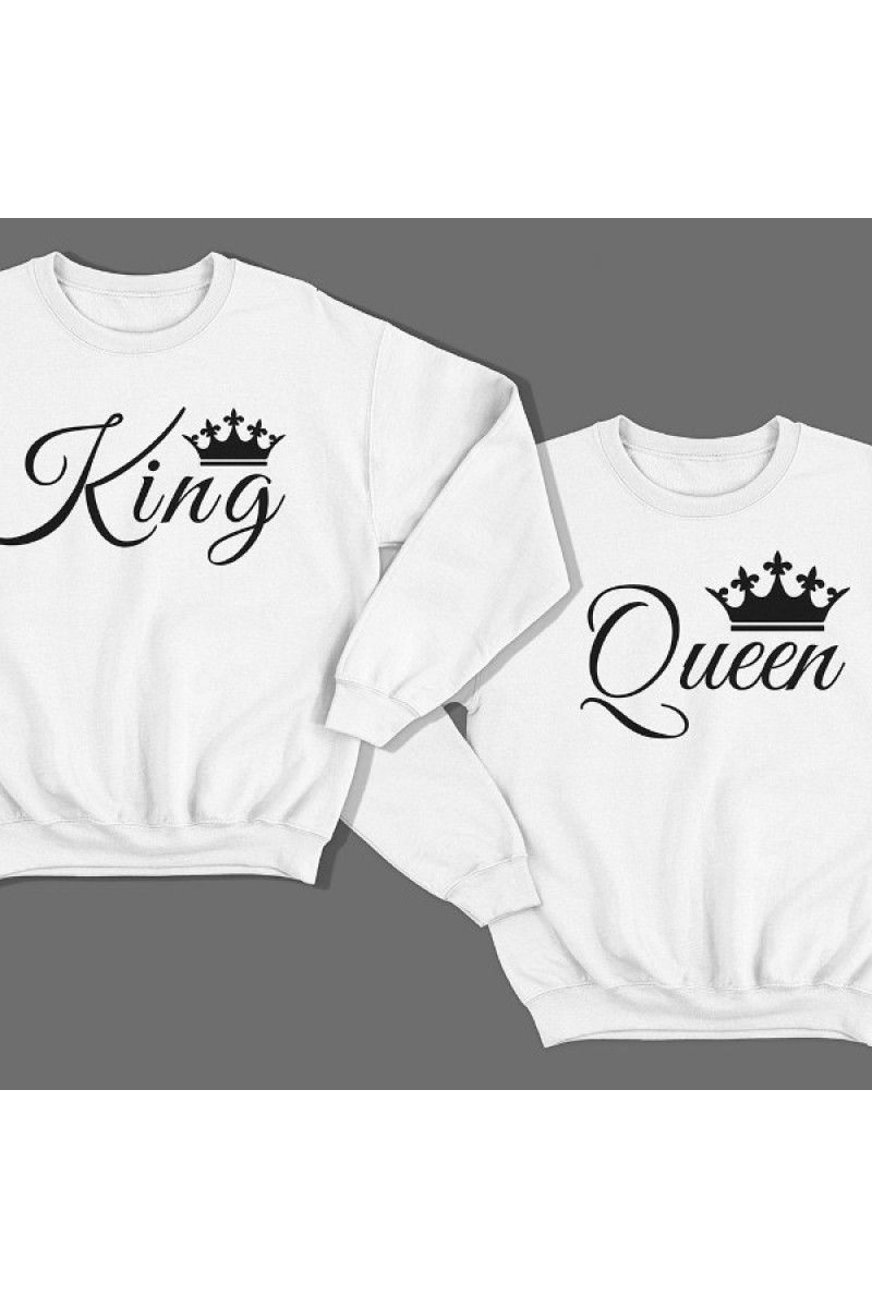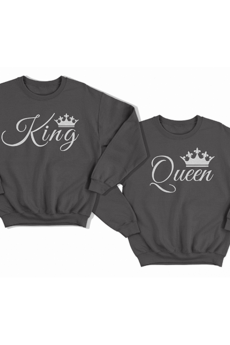 Парные свитшоты для влюбленных с надписями "King" ("Король") для него и "Queen" ("Королева") для неё. Помимо надписи на принте есть изображения короны.