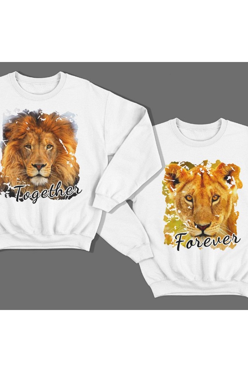 Парные свитшоты для влюбленных с изображениями льва и львицы и надписью "Tоgether forever" (Вместе навсегда).