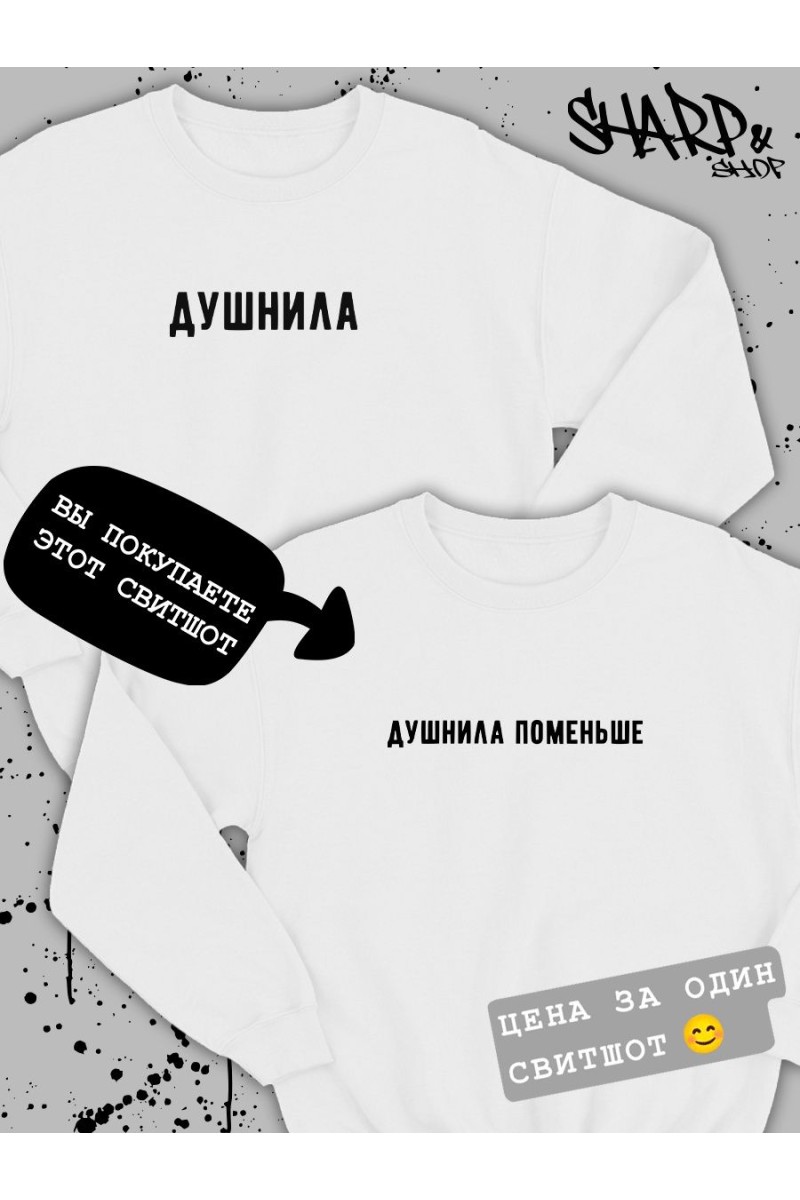 ВНИМАНИЕ! Вы заказываете ОДИН свитшот (на картинке она помечана ярлычком). Пару к ней ищите в карусели). В этой карточке товара есть свитшоты (футболки, худи) Арбузер&Встречаюсь с арбузером, Биба&Боба, Душнила&Душнила поменьше, Ее котик&Его киса, Виноват&Не виновата, Люблю свою жену&Люблю своего мужа, Сладенькое&Люблю сладенькое, Терпение&Вынос мозга. Парные свитшоты для двоих влюбленных с принтом, парные толстовки для подруг – отличный подарок на любой праздник: день влюбленных 14 февраля, день рождения, годовщину. Парные вещи для влюбленных парня и девушки – прекрасный вариант для модного парного лука, парные толстовки для пар могут быть как приколы для друзей. Черная белая парные свитшоты оверсайз с принтом смешными надписями не только разнообразят ваш гардероб, но и привлекут внимание к вашей паре на улице. Парные вещи для подруг пар всегда порадуют вас как подарок для парня, девушки. Парная одежда для семьи, товары для влюбленных подойдут для лп, мужа и жены как комфортная домашняя одежда и как парные костюмы для парня и девушки на свидание, для прогулки, похода в кино, кафе и фотосессии. Парные худи с парнем для подруг подойдут под спортивный и повседневный стиль. Если не знаете, что подарить на день Святого Валентина подарки какие выбрать для друзей лучшей подруги парня девушки жены папы мамы сестры брата, то парные кофты для двоих – лучший вариант. Парные толстовки оверсайз без капюшона как парный подарок для влюбленных. В нашем магазине есть парные толстовки футболки для влюбленных свободного кроя больших размеров 3xl. Если любите oversize, рекомендуем заказать на 1-2 размера больше. Тогда молодежная одежда будет смотреться стильно и не будет сковывать движений. Отличный выбор как свитер женский мужской для спорта. Кофта унисекс сделана из мягкой ткани эко хлопок 100%, имеет прочные ровные швы. Парные толстовки для влюбленных высокого качества, не портятся после стирки. Стирать при температуре не выше 30°, вывернув наизнанку, отжимать при малом количестве оборотов, машинная сушка запрещена. При соблюдении рекомендаций парные кофты для влюбленных оверсайз будут продолжать радовать вас, яркий принт не будет трескаться и тускнеть.