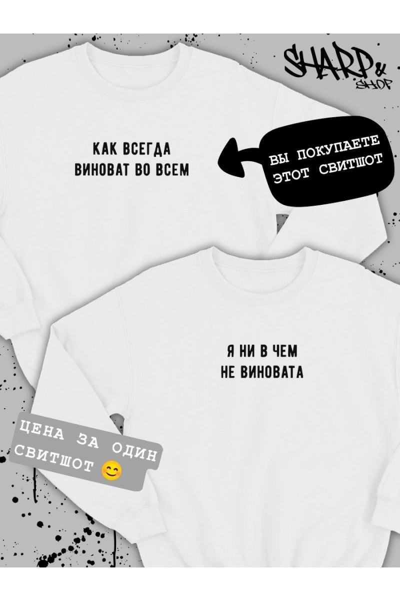 ВНИМАНИЕ! Вы заказываете ОДИН свитшот (на картинке она помечана ярлычком). Пару к ней ищите в карусели). В этой карточке товара есть свитшоты (футболки, худи) Арбузер&Встречаюсь с арбузером, Биба&Боба, Душнила&Душнила поменьше, Ее котик&Его киса, Виноват&Не виновата, Люблю свою жену&Люблю своего мужа, Сладенькое&Люблю сладенькое, Терпение&Вынос мозга. Парные свитшоты для двоих влюбленных с принтом, парные толстовки для подруг – отличный подарок на любой праздник: день влюбленных 14 февраля, день рождения, годовщину. Парные вещи для влюбленных парня и девушки – прекрасный вариант для модного парного лука, парные толстовки для пар могут быть как приколы для друзей. Черная белая парные свитшоты оверсайз с принтом смешными надписями не только разнообразят ваш гардероб, но и привлекут внимание к вашей паре на улице. Парные вещи для подруг пар всегда порадуют вас как подарок для парня, девушки. Парная одежда для семьи, товары для влюбленных подойдут для лп, мужа и жены как комфортная домашняя одежда и как парные костюмы для парня и девушки на свидание, для прогулки, похода в кино, кафе и фотосессии. Парные худи с парнем для подруг подойдут под спортивный и повседневный стиль. Если не знаете, что подарить на день Святого Валентина подарки какие выбрать для друзей лучшей подруги парня девушки жены папы мамы сестры брата, то парные кофты для двоих – лучший вариант. Парные толстовки оверсайз без капюшона как парный подарок для влюбленных. В нашем магазине есть парные толстовки футболки для влюбленных свободного кроя больших размеров 3xl. Если любите oversize, рекомендуем заказать на 1-2 размера больше. Тогда молодежная одежда будет смотреться стильно и не будет сковывать движений. Отличный выбор как свитер женский мужской для спорта. Кофта унисекс сделана из мягкой ткани эко хлопок 100%, имеет прочные ровные швы. Парные толстовки для влюбленных высокого качества, не портятся после стирки. Стирать при температуре не выше 30°, вывернув наизнанку, отжимать при малом количестве оборотов, машинная сушка запрещена. При соблюдении рекомендаций парные кофты для влюбленных оверсайз будут продолжать радовать вас, яркий принт не будет трескаться и тускнеть.