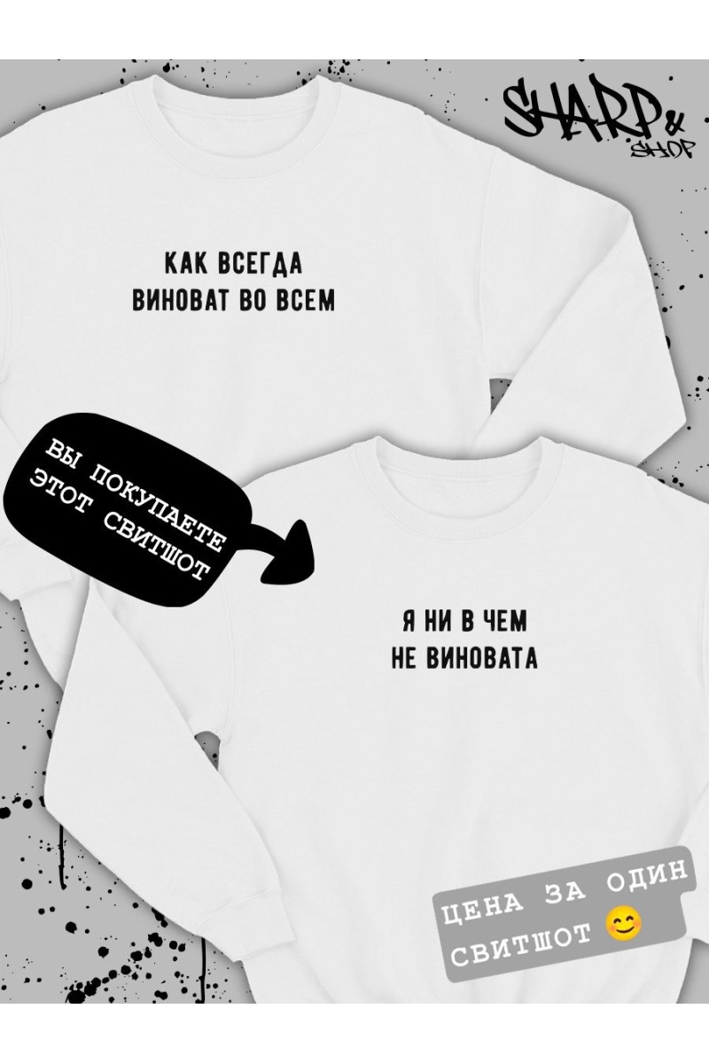 ВНИМАНИЕ! Вы заказываете ОДИН свитшот (на картинке она помечана ярлычком). Пару к ней ищите в карусели). В этой карточке товара есть свитшоты (футболки, худи) Арбузер&Встречаюсь с арбузером, Биба&Боба, Душнила&Душнила поменьше, Ее котик&Его киса, Виноват&Не виновата, Люблю свою жену&Люблю своего мужа, Сладенькое&Люблю сладенькое, Терпение&Вынос мозга. Парные свитшоты для двоих влюбленных с принтом, парные толстовки для подруг – отличный подарок на любой праздник: день влюбленных 14 февраля, день рождения, годовщину. Парные вещи для влюбленных парня и девушки – прекрасный вариант для модного парного лука, парные толстовки для пар могут быть как приколы для друзей. Черная белая парные свитшоты оверсайз с принтом смешными надписями не только разнообразят ваш гардероб, но и привлекут внимание к вашей паре на улице. Парные вещи для подруг пар всегда порадуют вас как подарок для парня, девушки. Парная одежда для семьи, товары для влюбленных подойдут для лп, мужа и жены как комфортная домашняя одежда и как парные костюмы для парня и девушки на свидание, для прогулки, похода в кино, кафе и фотосессии. Парные худи с парнем для подруг подойдут под спортивный и повседневный стиль. Если не знаете, что подарить на день Святого Валентина подарки какие выбрать для друзей лучшей подруги парня девушки жены папы мамы сестры брата, то парные кофты для двоих – лучший вариант. Парные толстовки оверсайз без капюшона как парный подарок для влюбленных. В нашем магазине есть парные толстовки футболки для влюбленных свободного кроя больших размеров 3xl. Если любите oversize, рекомендуем заказать на 1-2 размера больше. Тогда молодежная одежда будет смотреться стильно и не будет сковывать движений. Отличный выбор как свитер женский мужской для спорта. Кофта унисекс сделана из мягкой ткани эко хлопок 100%, имеет прочные ровные швы. Парные толстовки для влюбленных высокого качества, не портятся после стирки. Стирать при температуре не выше 30°, вывернув наизнанку, отжимать при малом количестве оборотов, машинная сушка запрещена. При соблюдении рекомендаций парные кофты для влюбленных оверсайз будут продолжать радовать вас, яркий принт не будет трескаться и тускнеть.