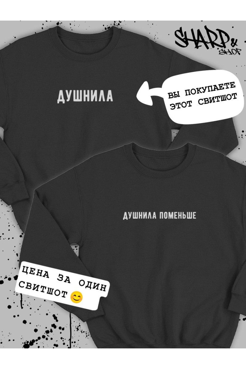 ВНИМАНИЕ! Вы заказываете ОДИН свитшот (на картинке она помечана ярлычком). Пару к ней ищите в карусели). В этой карточке товара есть свитшоты (футболки, худи) Арбузер&Встречаюсь с арбузером, Биба&Боба, Душнила&Душнила поменьше, Ее котик&Его киса, Виноват&Не виновата, Люблю свою жену&Люблю своего мужа, Сладенькое&Люблю сладенькое, Терпение&Вынос мозга. Парные свитшоты для двоих влюбленных с принтом, парные толстовки для подруг – отличный подарок на любой праздник: день влюбленных 14 февраля, день рождения, годовщину. Парные вещи для влюбленных парня и девушки – прекрасный вариант для модного парного лука, парные толстовки для пар могут быть как приколы для друзей. Черная белая парные свитшоты оверсайз с принтом смешными надписями не только разнообразят ваш гардероб, но и привлекут внимание к вашей паре на улице. Парные вещи для подруг пар всегда порадуют вас как подарок для парня, девушки. Парная одежда для семьи, товары для влюбленных подойдут для лп, мужа и жены как комфортная домашняя одежда и как парные костюмы для парня и девушки на свидание, для прогулки, похода в кино, кафе и фотосессии. Парные худи с парнем для подруг подойдут под спортивный и повседневный стиль. Если не знаете, что подарить на день Святого Валентина подарки какие выбрать для друзей лучшей подруги парня девушки жены папы мамы сестры брата, то парные кофты для двоих – лучший вариант. Парные толстовки оверсайз без капюшона как парный подарок для влюбленных. В нашем магазине есть парные толстовки футболки для влюбленных свободного кроя больших размеров 3xl. Если любите oversize, рекомендуем заказать на 1-2 размера больше. Тогда молодежная одежда будет смотреться стильно и не будет сковывать движений. Отличный выбор как свитер женский мужской для спорта. Кофта унисекс сделана из мягкой ткани эко хлопок 100%, имеет прочные ровные швы. Парные толстовки для влюбленных высокого качества, не портятся после стирки. Стирать при температуре не выше 30°, вывернув наизнанку, отжимать при малом количестве оборотов, машинная сушка запрещена. При соблюдении рекомендаций парные кофты для влюбленных оверсайз будут продолжать радовать вас, яркий принт не будет трескаться и тускнеть.