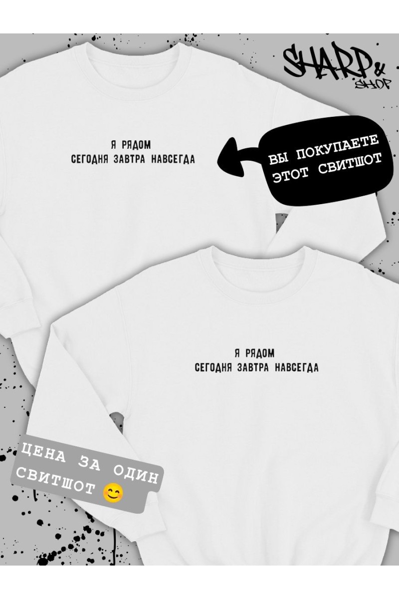 ВНИМАНИЕ! Вы заказываете ОДИН свитшот (на картинке она помечана ярлычком). Пару к ней ищите в карусели). В этой карточке товара есть свитшоты Хулиган&Девочка пай, Хулиган&Хулиганка, Царь&Жена царя, Целуй&Обнимай, Я рядом&Я рядом, Я твой недостаток&Я твоя вселенная, Я тебя люблю&Я знаю, ЯЖБАТЯ&ЯЖМАТЬ, Night&Day. Парные свитшоты для влюбленных с принтом надписями парная одежда для подруг – классный подарок на любой праздник: день рождения, день влюбленных 14 февраля, годовщину. Парные толстовки для пар двоих друзей – отличный вариант для модного лука и как подарок парню девушке. Парные вещи для влюбленных для парня и девушки могут быть как приколы для друзей. Черная белая парные кофты для влюбленных с прикольным принтом и смешными надписями не только украсят ваш гардероб, но и привлекут внимание к вашей паре на улице. Парные вещи для подруг, пар всегда порадуют вас как подарок для парня, девушки. Парная одежда для семьи, товары для влюбленных также подойдут для лучшей подруги, мужа и жены как домашняя одежда и как парные костюмы для парня и девушки на свидание, похода в кино кафе и фотосессии. Парные толстовки для двоих оверсайз подойдут под спортивный повседневный стиль. Если не знаете, что подарить на день влюбленных Святого Валентина подарки какие выбрать для друзей лп парня девушки молодоженов мужа жены папы мамы, то парная одежда для пар – лучший вариант. Кофта женская мужская оверсайз как парный подарок для влюбленных для пары. В нашем магазине есть парные толстовки футболки для влюбленных свободного кроя больших размеров 3xl. Если любите oversize, рекомендуем заказать на 1-2 размера больше. Тогда парные вещи для влюбленных будут смотреться стильно и не будут сковывать движений. Отличный выбор как свитшот оверсайз на лето. Парные толстовки для подруг сделаны из мягкой ткани 100% хлопок, имеет прочные ровные швы. Молодежная одежда для женщин и мужчин, подростков кофта унисекс высокого качества, не портится после стирки. Стирать, вывернув наизнанку при температуре не выше 30°, отжимать при малом количестве оборотов, машинная сушка запрещена. При соблюдении рекомендаций яркий принт не будет трескаться и тускнеть. Чтобы увидеть больше товаров с принтами, надписями и мемами, переходите в каталог бренда. Подписывайтесь на нас в Wildberries, чтобы следить за модными новинками :)