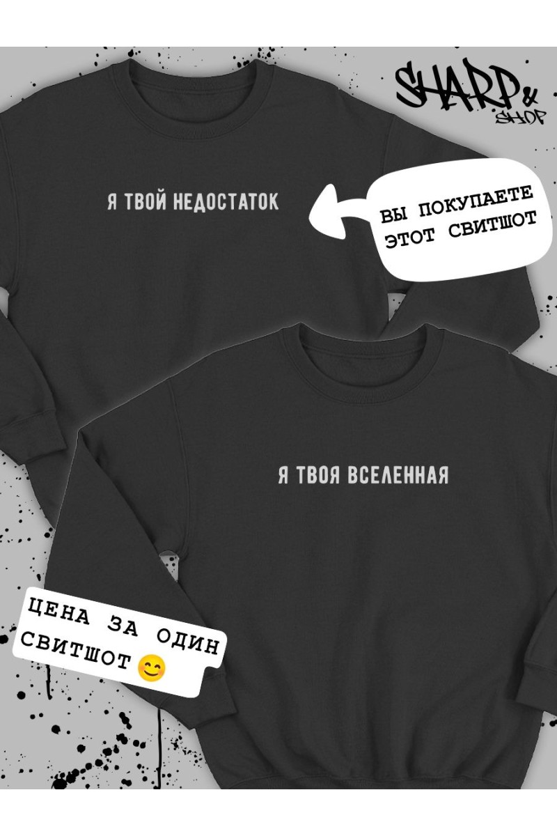 ВНИМАНИЕ! Вы заказываете ОДИН свитшот (на картинке она помечана ярлычком). Пару к ней ищите в карусели). В этой карточке товара есть свитшоты Хулиган&Девочка пай, Хулиган&Хулиганка, Царь&Жена царя, Целуй&Обнимай, Я рядом&Я рядом, Я твой недостаток&Я твоя вселенная, Я тебя люблю&Я знаю, ЯЖБАТЯ&ЯЖМАТЬ, Night&Day. Парные свитшоты для влюбленных с принтом надписями парная одежда для подруг – классный подарок на любой праздник: день рождения, день влюбленных 14 февраля, годовщину. Парные толстовки для пар двоих друзей – отличный вариант для модного лука и как подарок парню девушке. Парные вещи для влюбленных для парня и девушки могут быть как приколы для друзей. Черная белая парные кофты для влюбленных с прикольным принтом и смешными надписями не только украсят ваш гардероб, но и привлекут внимание к вашей паре на улице. Парные вещи для подруг, пар всегда порадуют вас как подарок для парня, девушки. Парная одежда для семьи, товары для влюбленных также подойдут для лучшей подруги, мужа и жены как домашняя одежда и как парные костюмы для парня и девушки на свидание, похода в кино кафе и фотосессии. Парные толстовки для двоих оверсайз подойдут под спортивный повседневный стиль. Если не знаете, что подарить на день влюбленных Святого Валентина подарки какие выбрать для друзей лп парня девушки молодоженов мужа жены папы мамы, то парная одежда для пар – лучший вариант. Кофта женская мужская оверсайз как парный подарок для влюбленных для пары. В нашем магазине есть парные толстовки футболки для влюбленных свободного кроя больших размеров 3xl. Если любите oversize, рекомендуем заказать на 1-2 размера больше. Тогда парные вещи для влюбленных будут смотреться стильно и не будут сковывать движений. Отличный выбор как свитшот оверсайз на лето. Парные толстовки для подруг сделаны из мягкой ткани 100% хлопок, имеет прочные ровные швы. Молодежная одежда для женщин и мужчин, подростков кофта унисекс высокого качества, не портится после стирки. Стирать, вывернув наизнанку при температуре не выше 30°, отжимать при малом количестве оборотов, машинная сушка запрещена. При соблюдении рекомендаций яркий принт не будет трескаться и тускнеть. Чтобы увидеть больше товаров с принтами, надписями и мемами, переходите в каталог бренда. Подписывайтесь на нас в Wildberries, чтобы следить за модными новинками :)