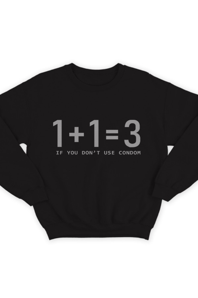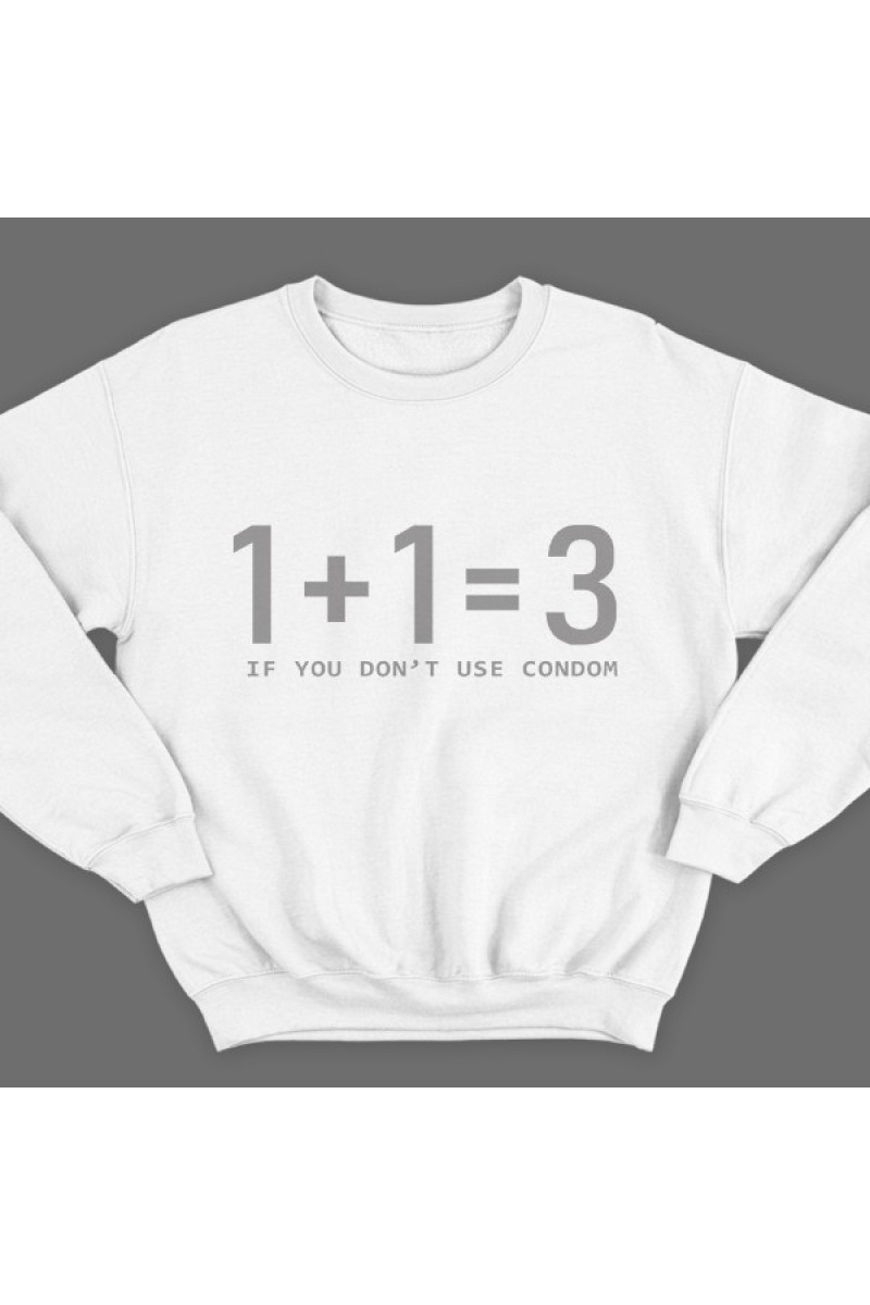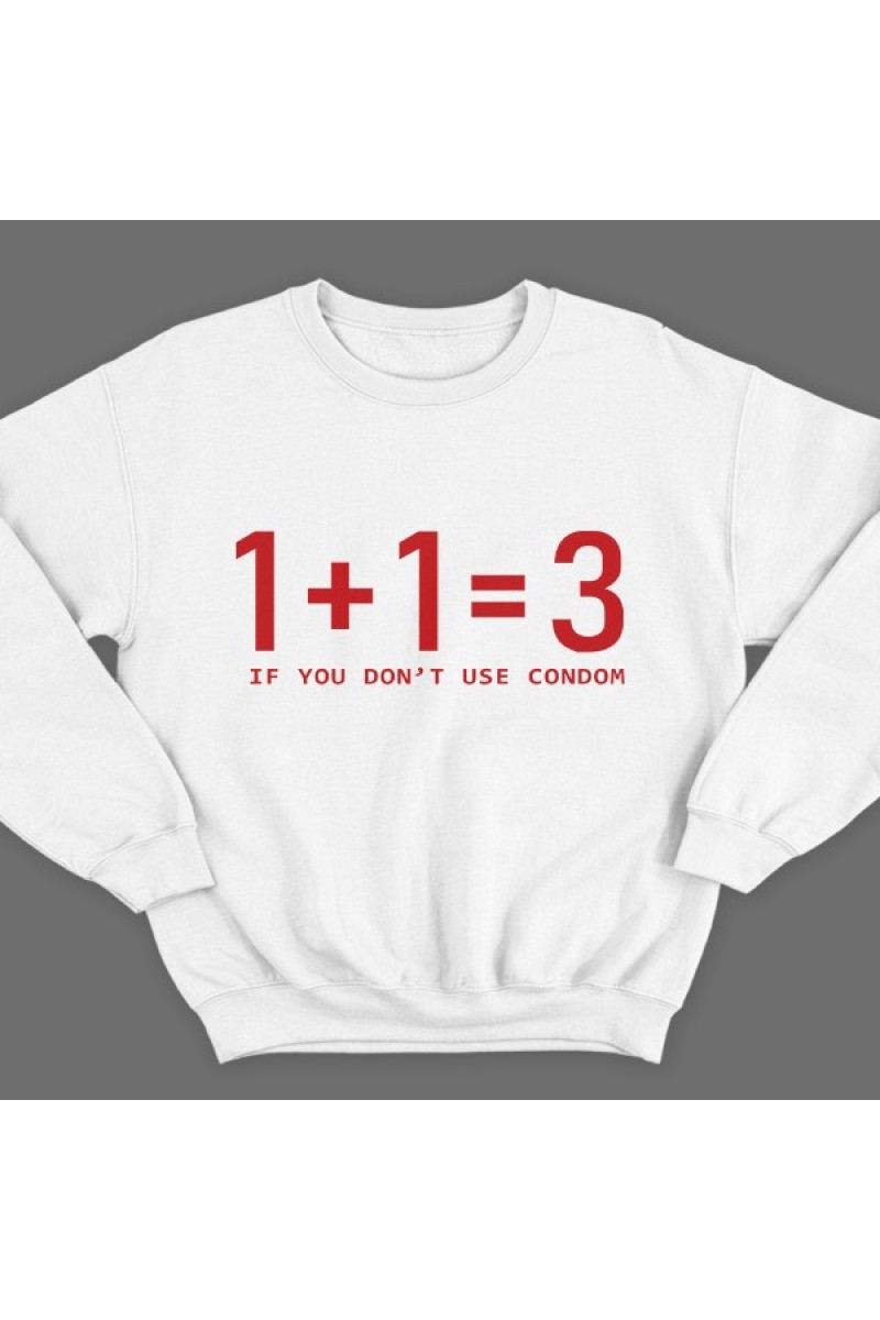 Прикольный свитшот с надписью "1+1=3 if you don't use condom" - 1+1=3 если не используешь презерватив".
