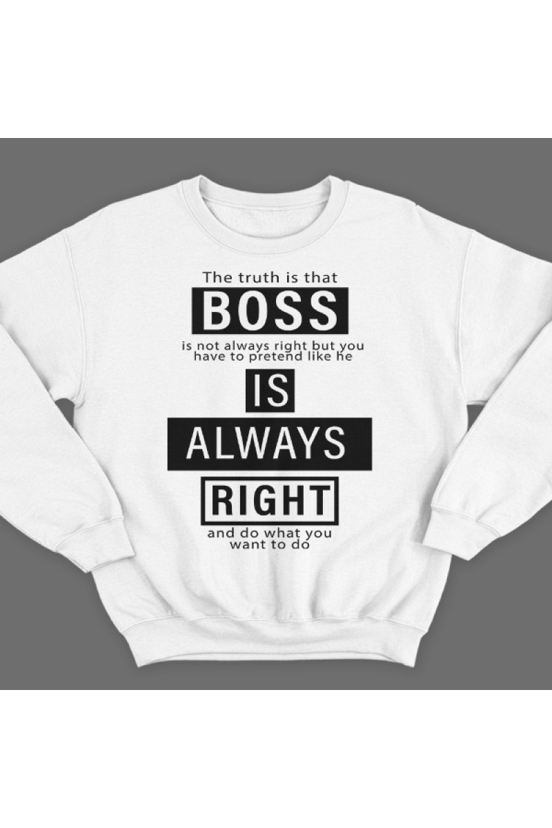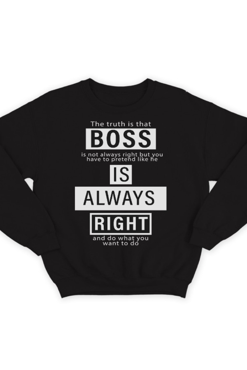 Прикольный свитшот с надписью "The truth is that BOSS is not always right, but you have to pretend like he IS ALWAYS and do what you want to do" - Правда в том что БОСС не всегда прав, но тебе нужно претвориться как будто он ВСЕГДА ПРАВ и делай все что ты захочешь.