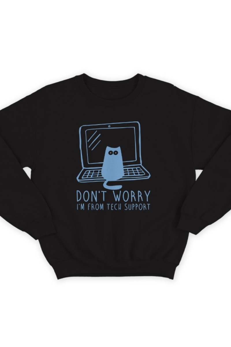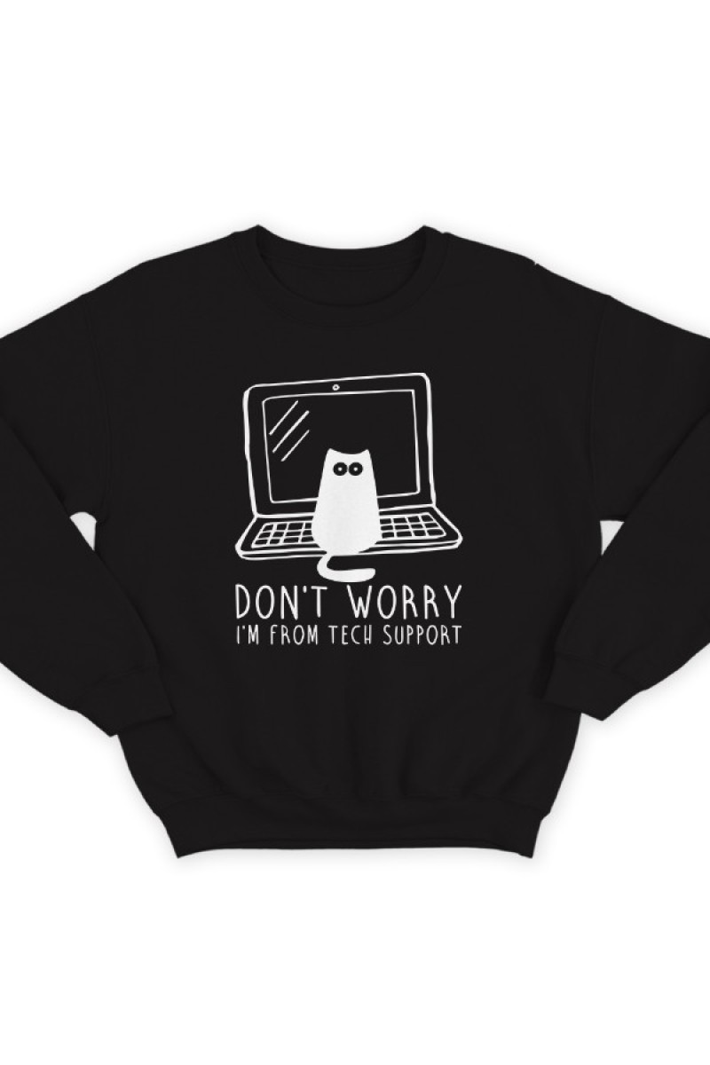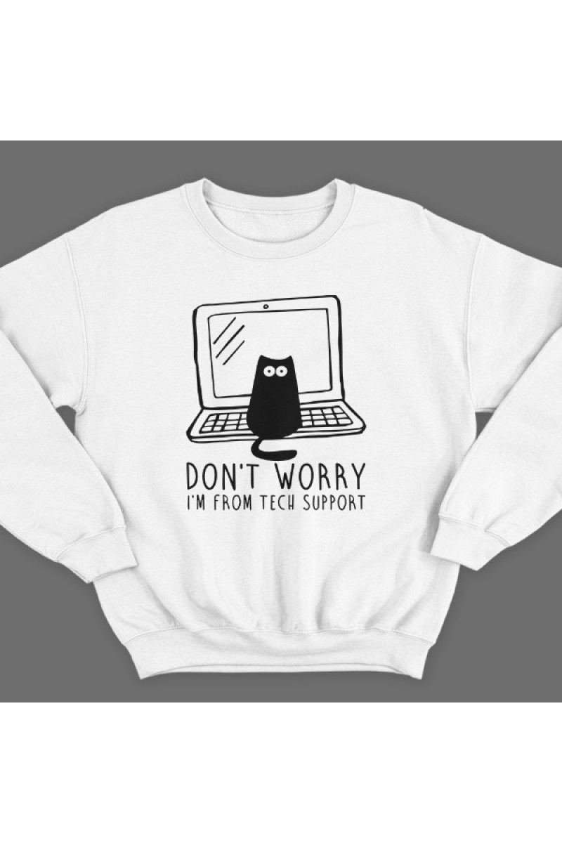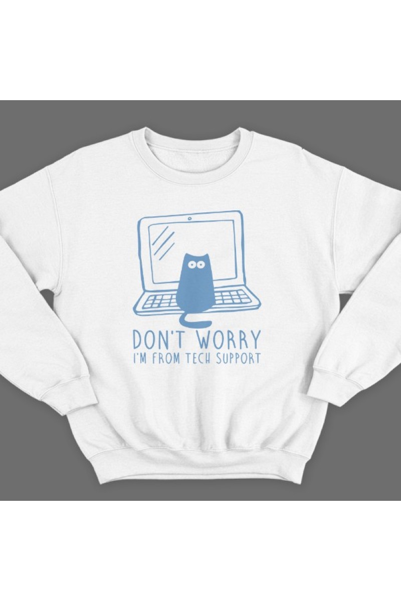 Прикольный свитшот с надписью "Don't worry, I'm from tech support" ("Не переживай, я из тех поддержки"). Помимо надписе на принте изображен котик на ноутбуке.