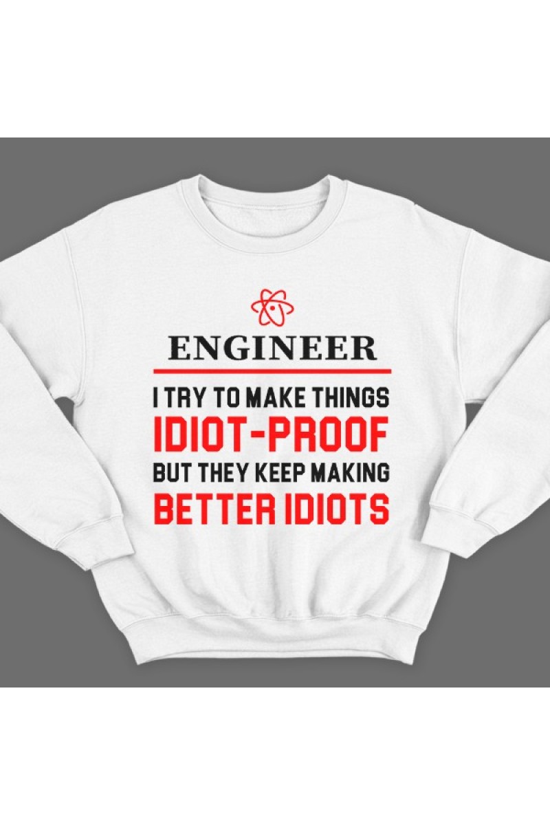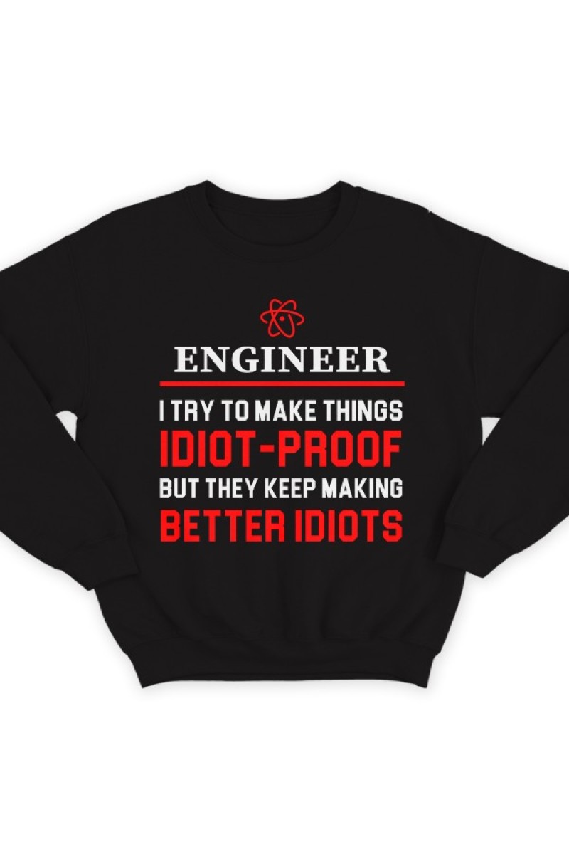 Прикольный свитшот с надписью "Engineer I try make thing IDIOT-PROOF, but they keep making BETTER IDIOTS" - "Я инженер. Я делаю вещи идиотоустойчивым, но они продолжают улучшать идиотов".