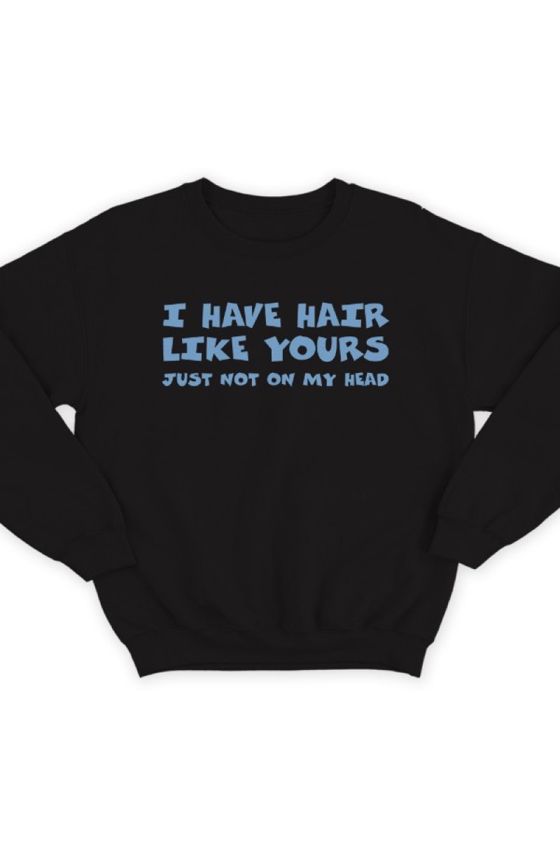 Прикольный свитшот с надписью "I have hair like yours just not on my head" - У меня такие же волосы как у тебя, только не на голове.