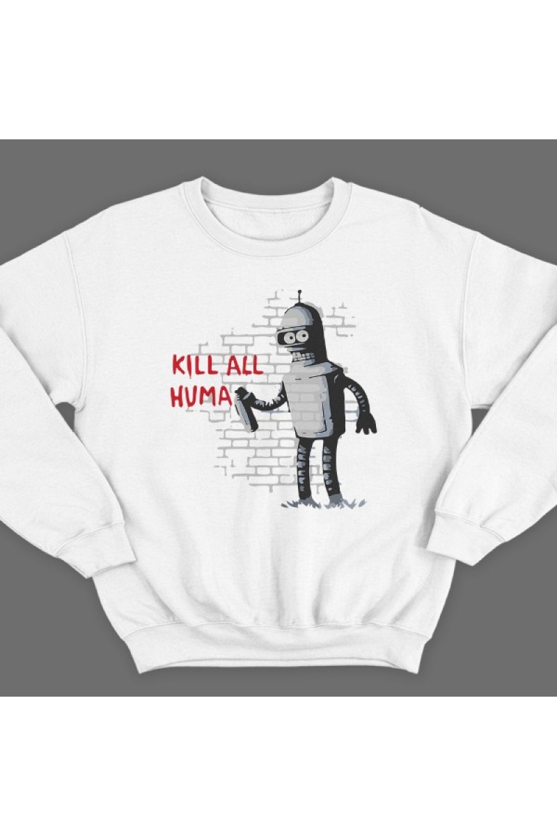 Прикольный свитшот с надписью "Kill all huma.." - Убить всех лю... Помимо надписи на принте есть изображение робота Бендера из Мультсериала "Футурама"