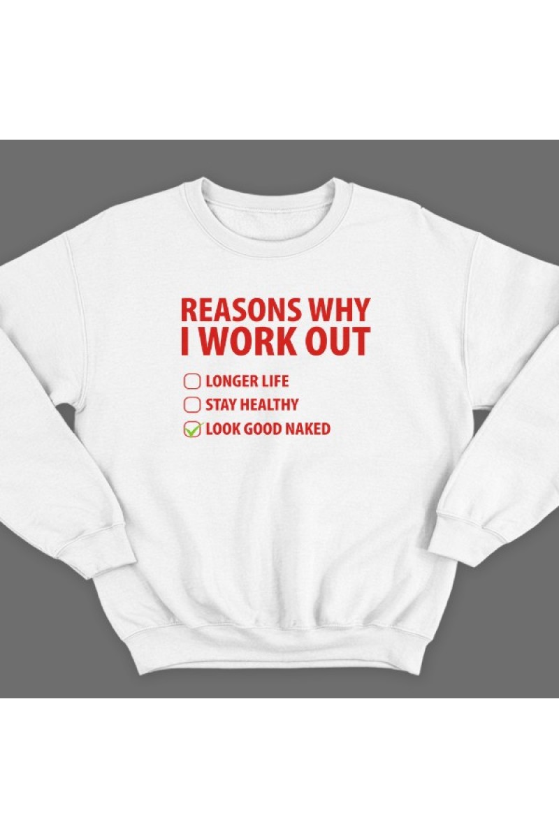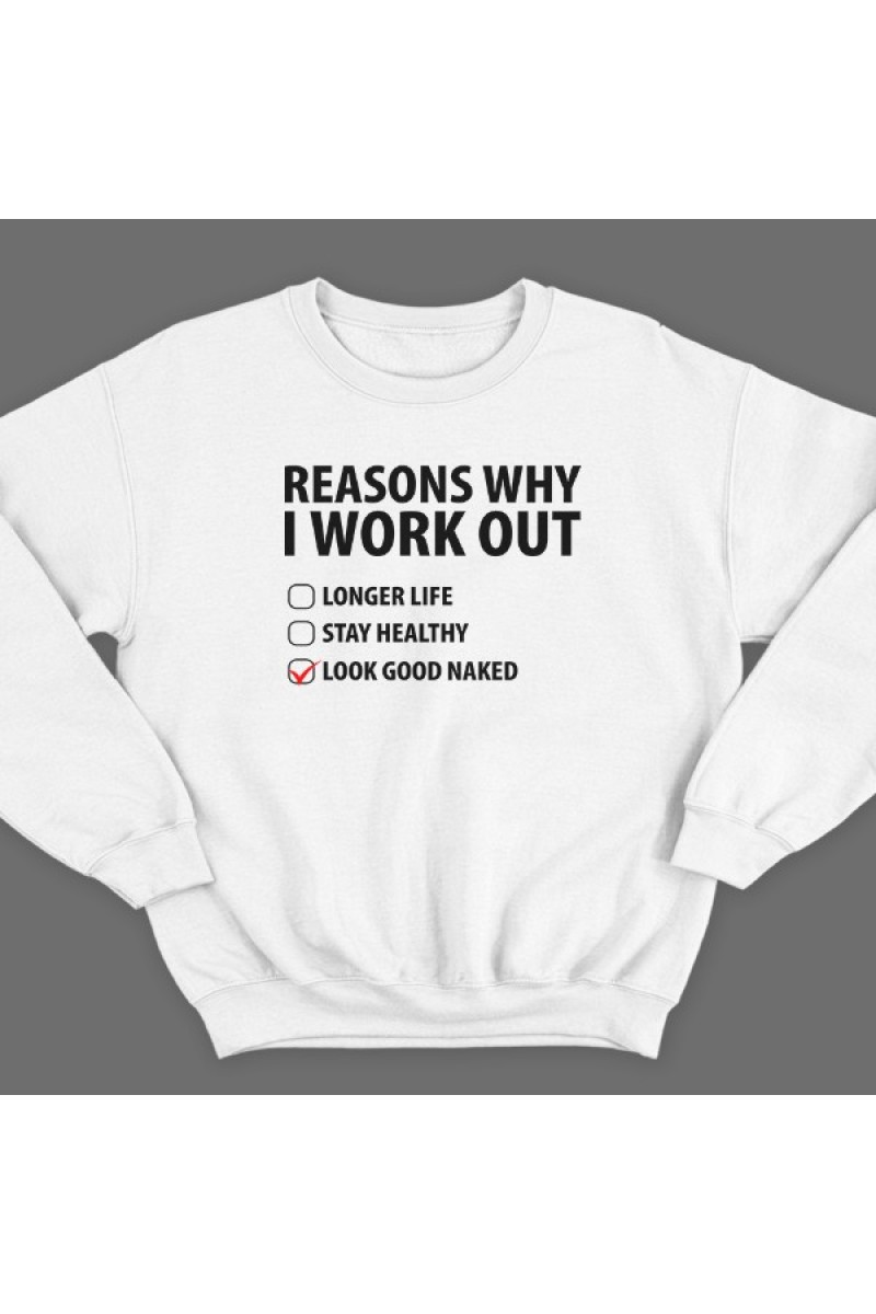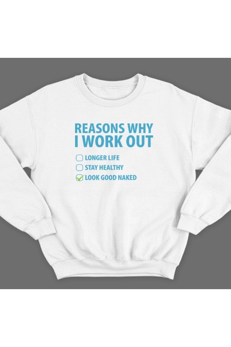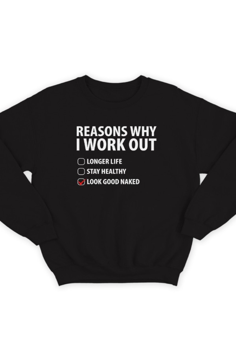 Прикольный свитшот с надписью "Reasons why i workout" ("Причины по которым я качаюсь") :