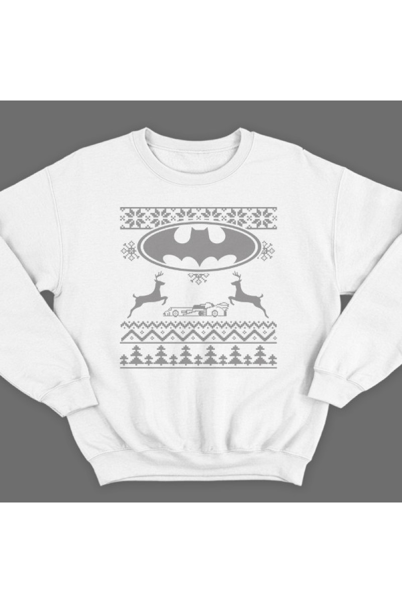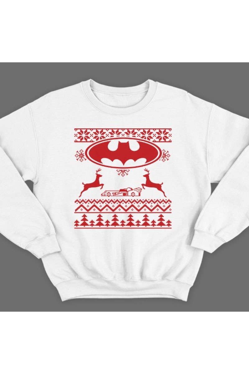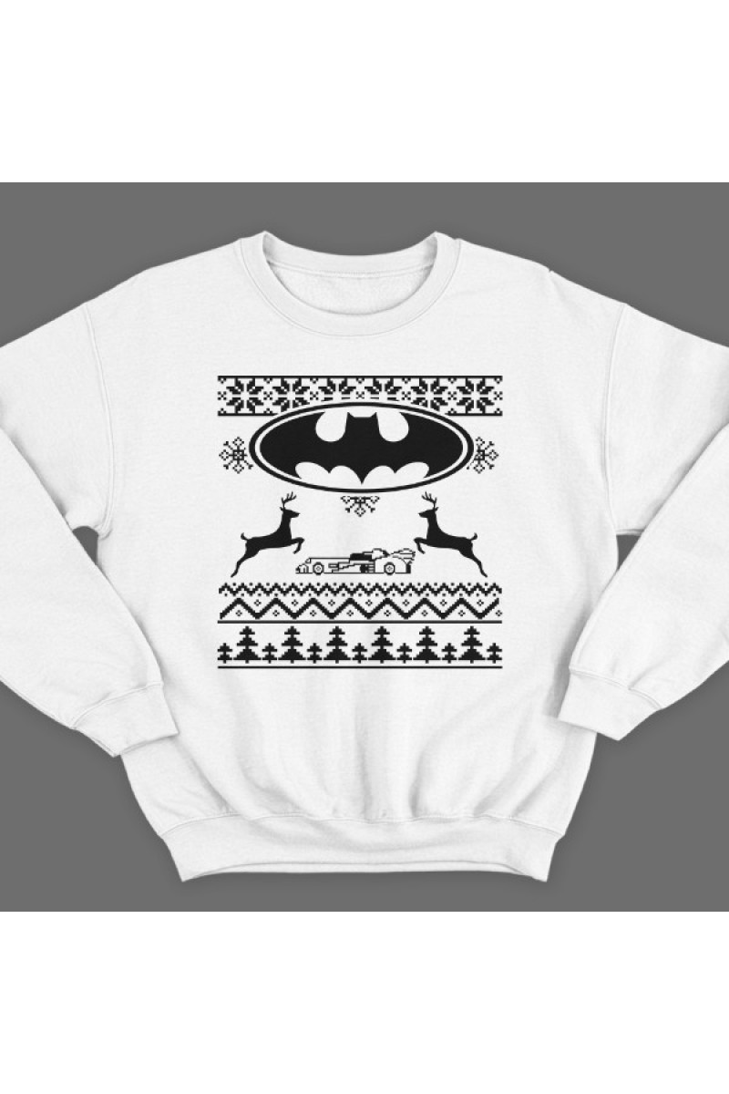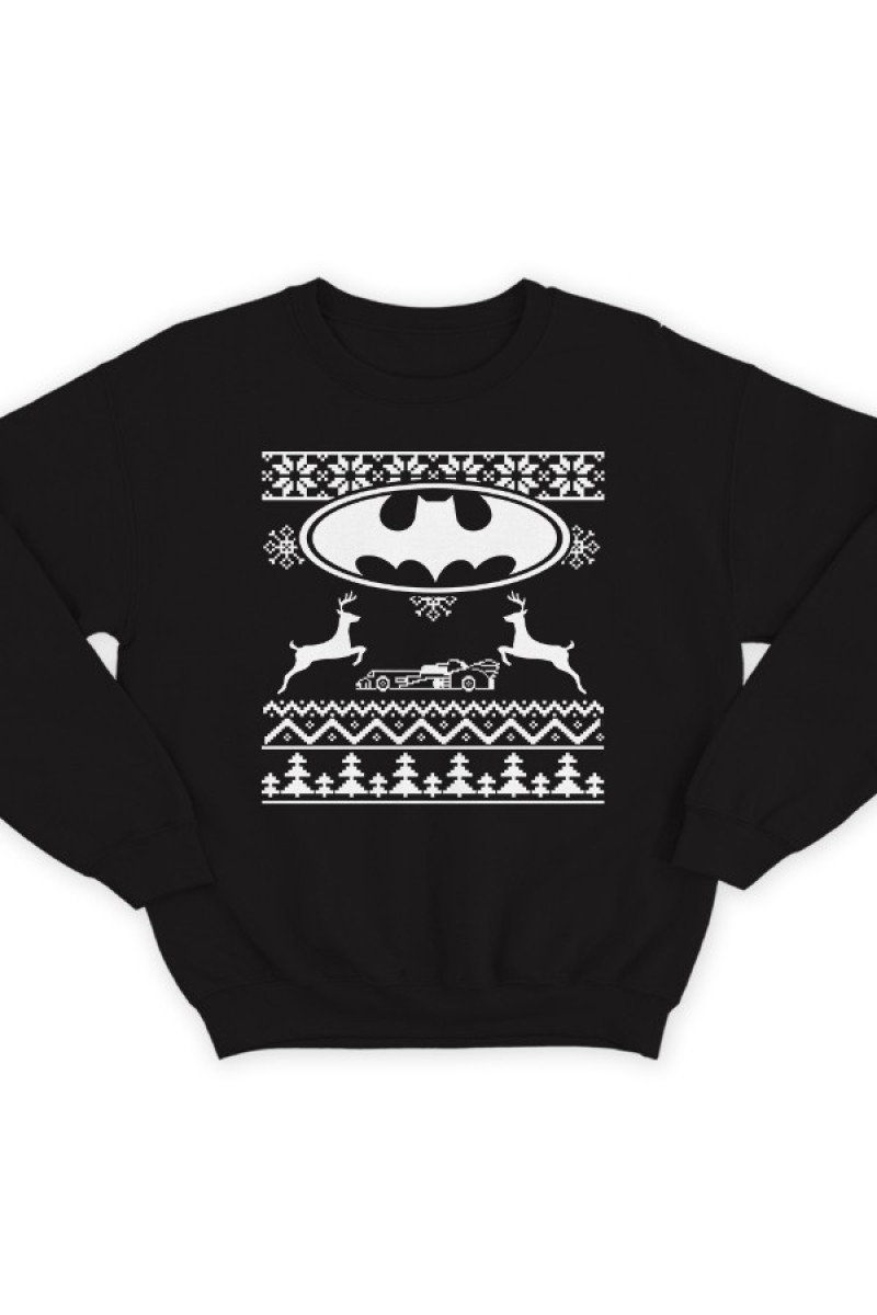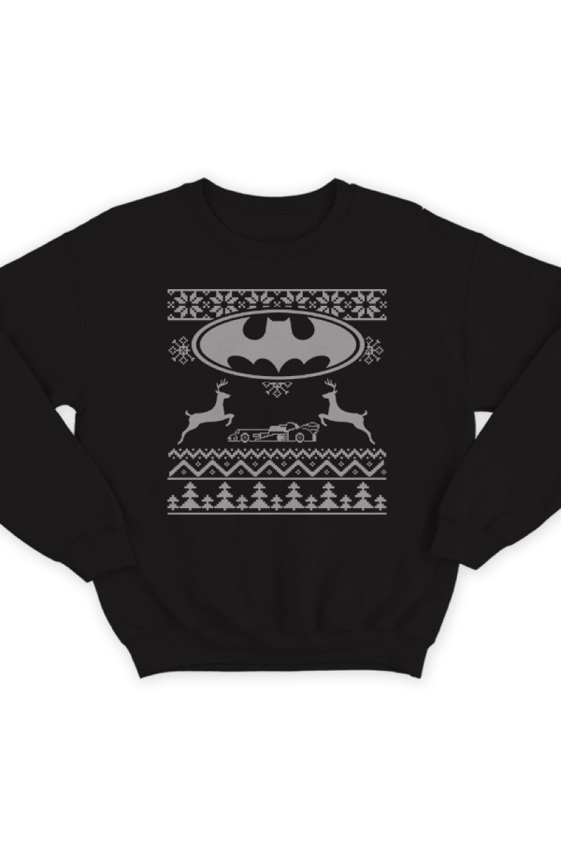 Прикольный свитшот с пародией на свитер с оленями. Вместо главного узора - логотип бэтмена и бэтмобиль.