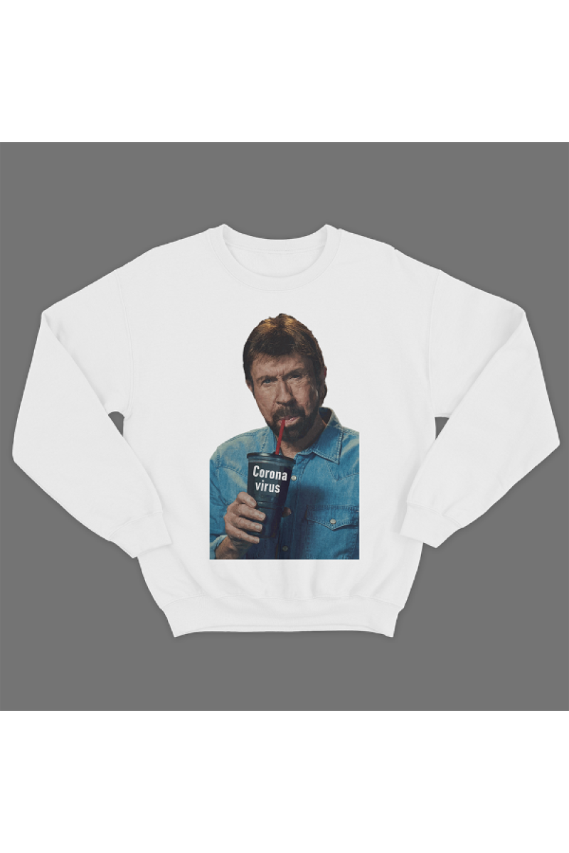 Прикольный свитшот с принтом на котором изображен Чак Норрис пьющий коронавирус.
