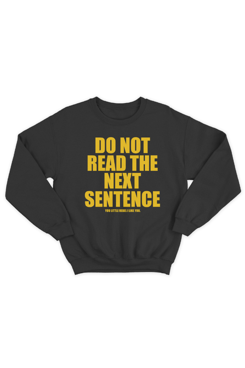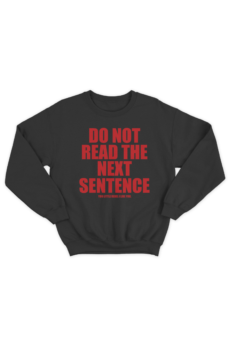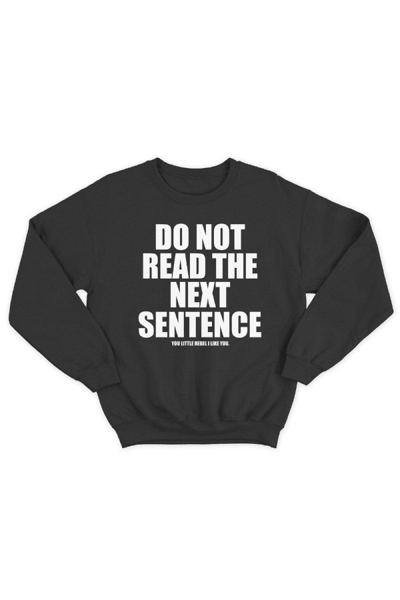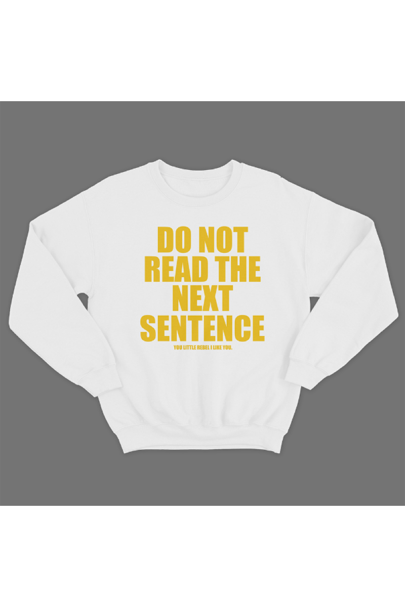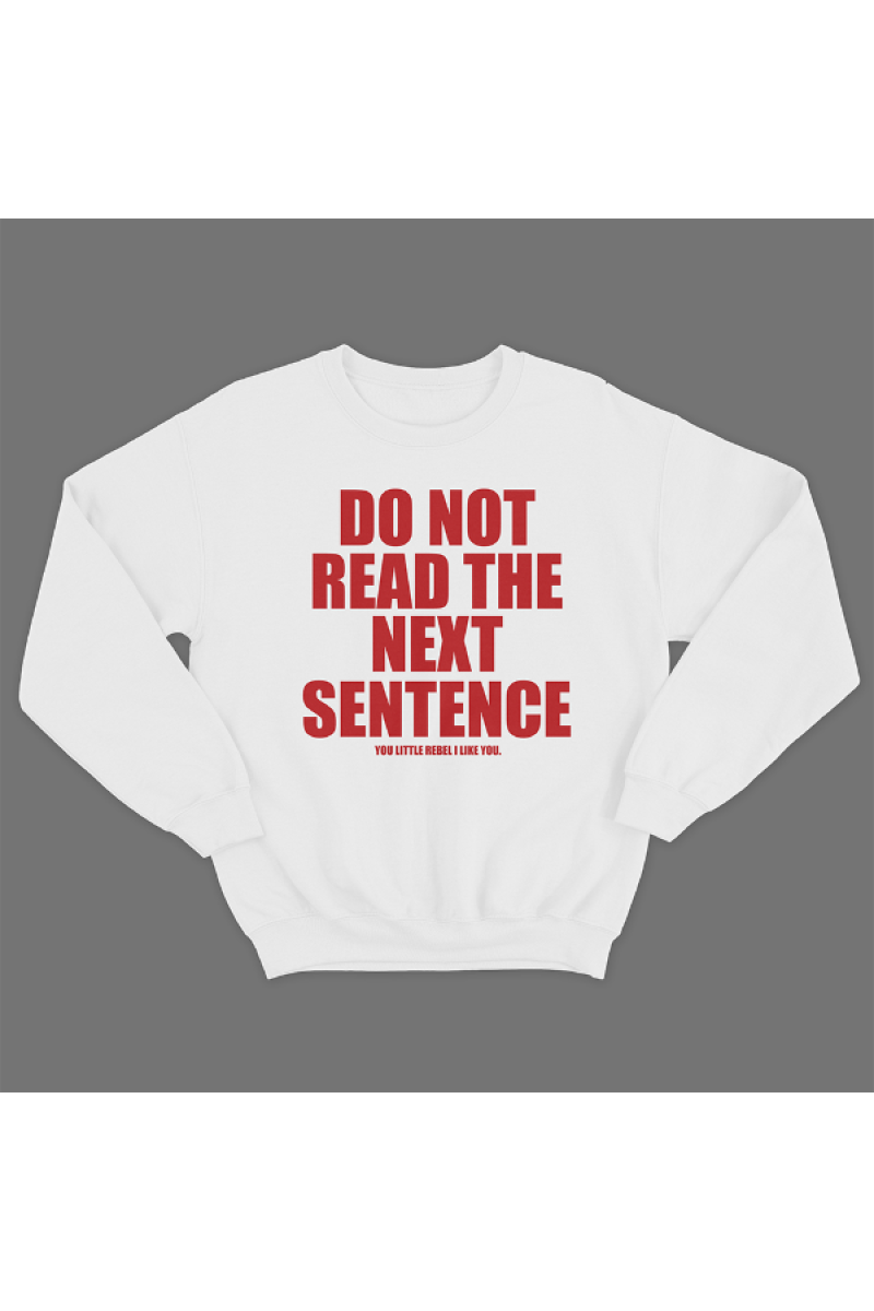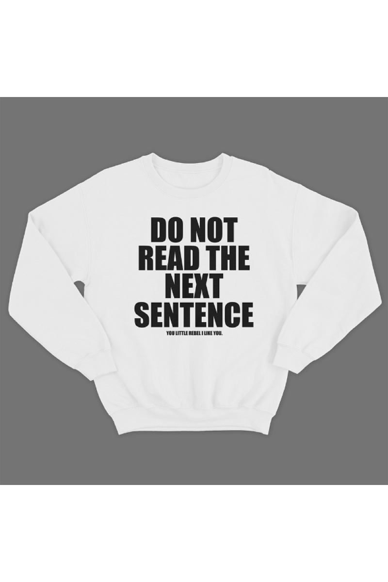 Прикольный свитшот с принтом "Do not read the next sentence" - "Не читай следующее предложение", и ниже - "You little rebel i like you" - "Ты маленький бунтарь, ты мне нравишься"