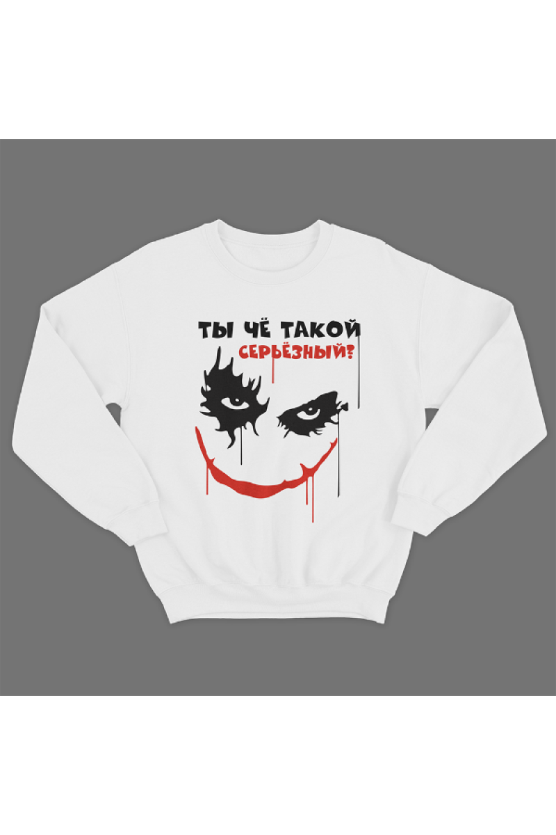Прикольный свитшот с принтом "Ты чё такой серьёзный?". Помимо надписи на принте изображено лицо Джокера.