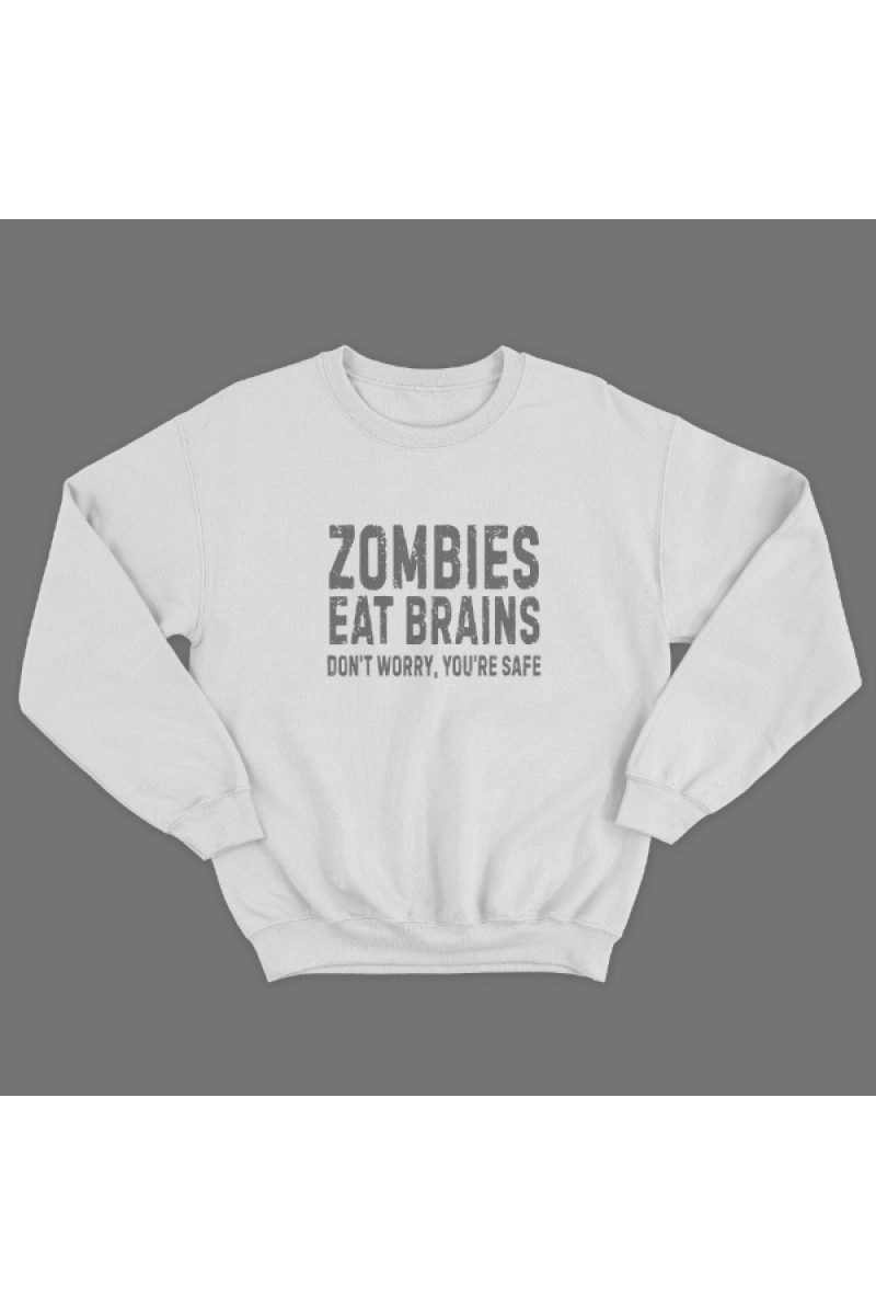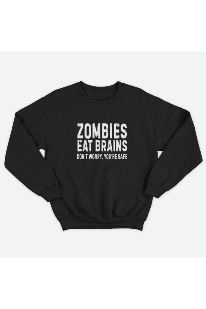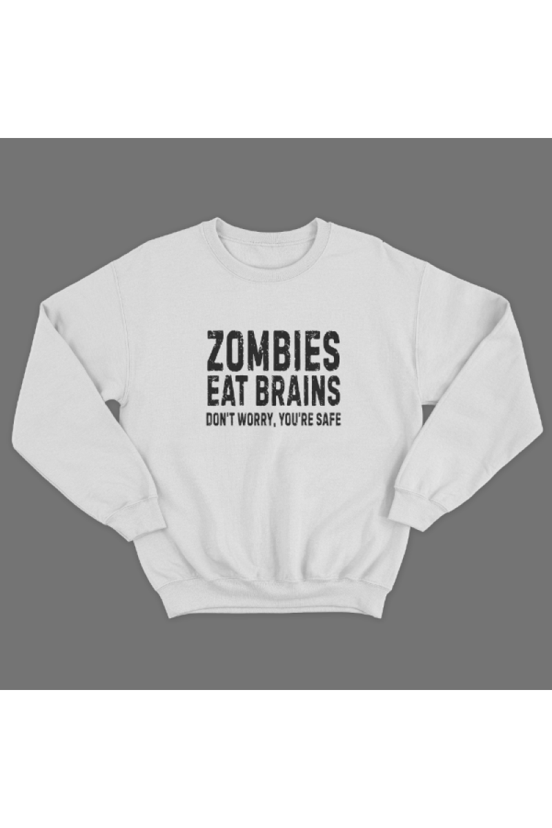 Прикольный свитшот с принтом "Zombies eat brains. Don't worry, you are safe" - "Зомби едят мозги. Не переживай, ты в безопасности".