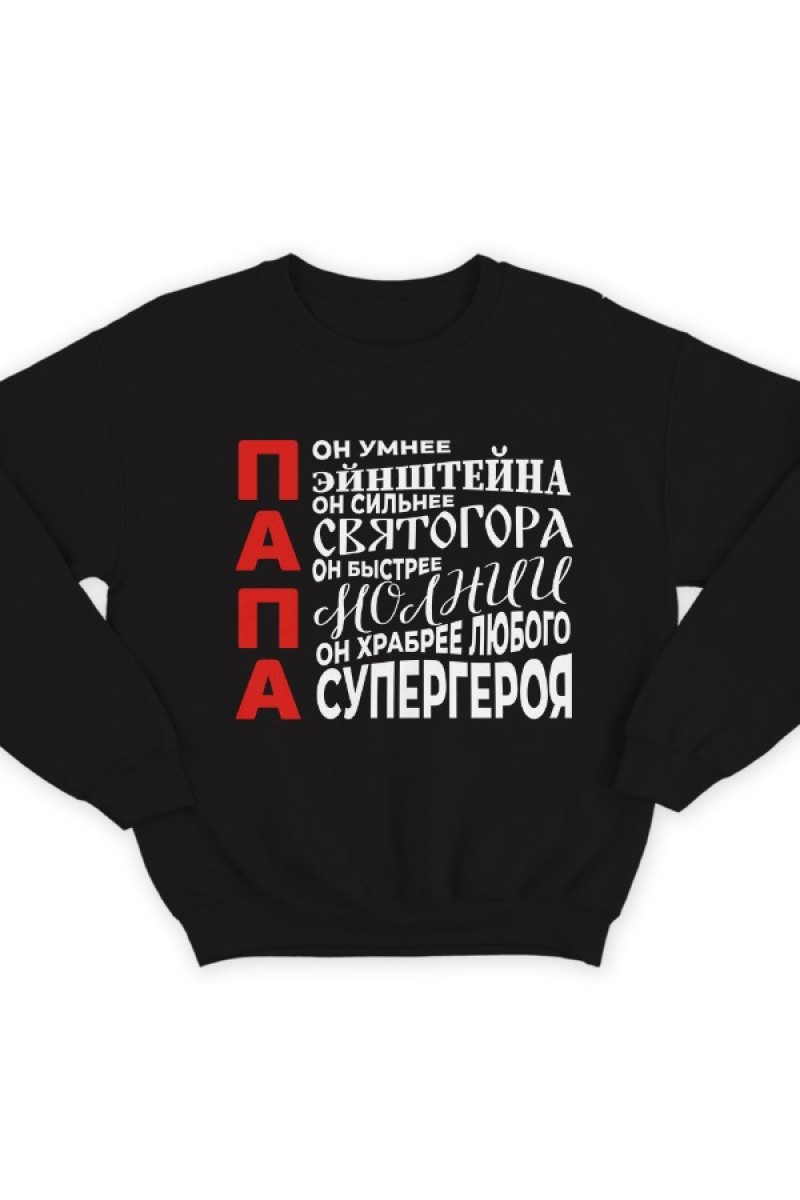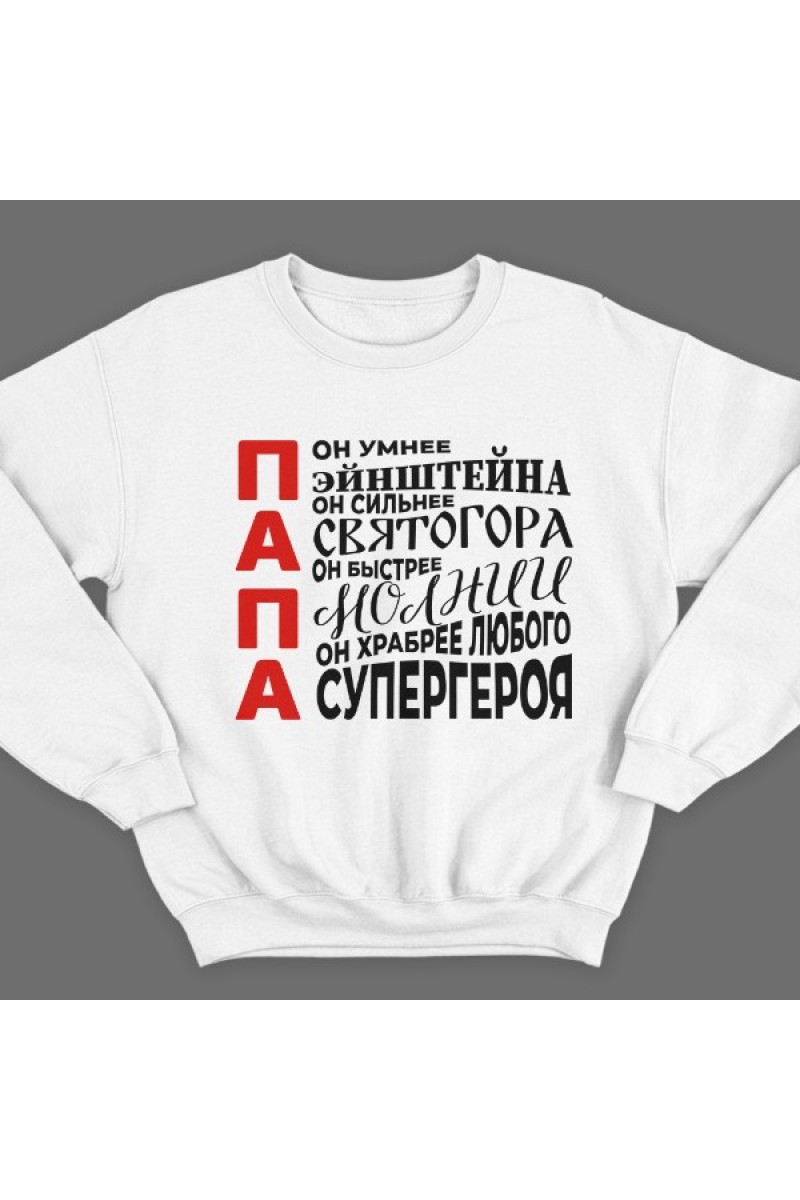 Веселый подарочный свитшот для папы с надписями "Он умнее Эйнштейна", "Он сильнее Святогора", "Он быстрее молнии", "Он храбрее любого супергероя"