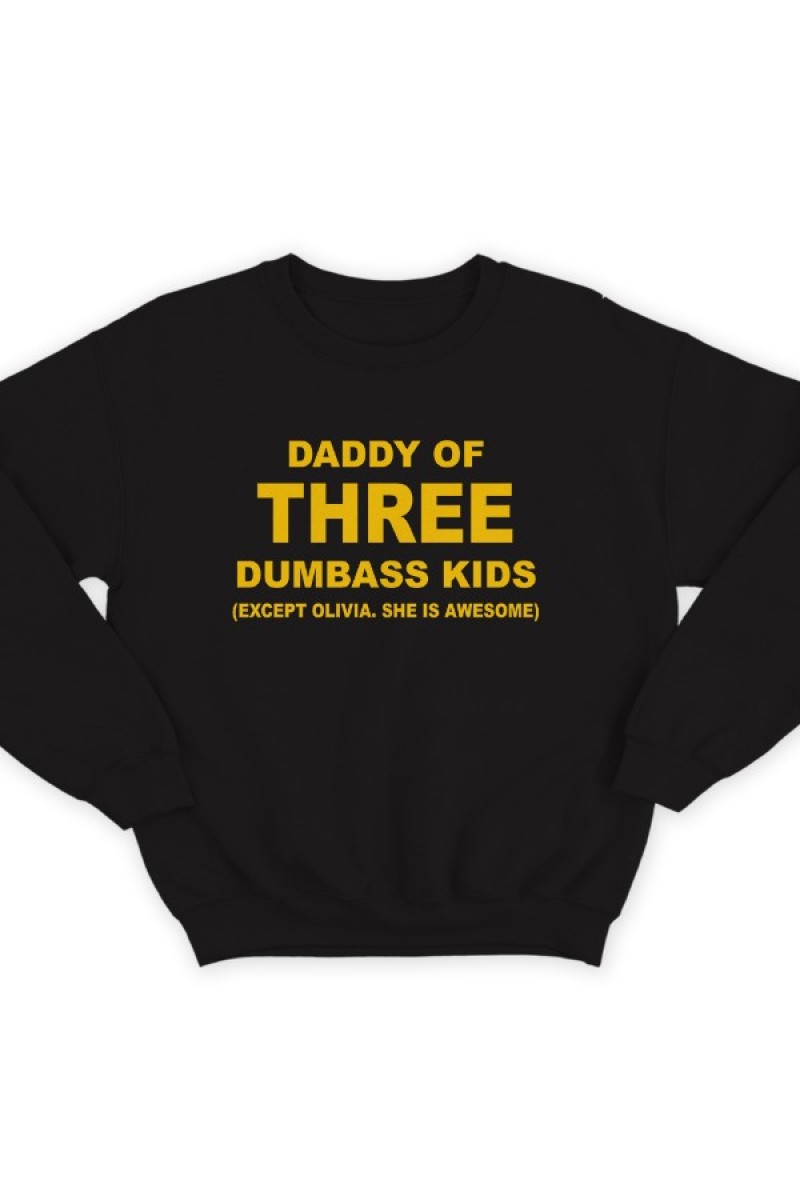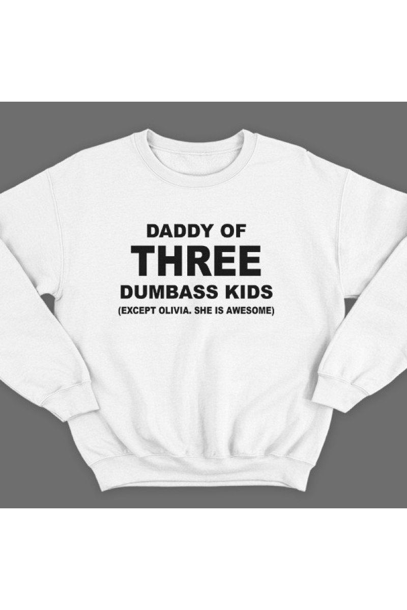 Свитшот для папы с надписью "Daddy of three dumbass kids (Except Olivia. She is awesome)"