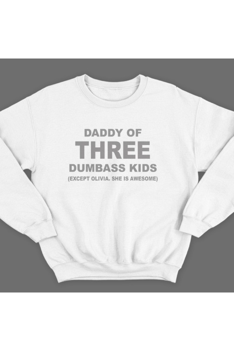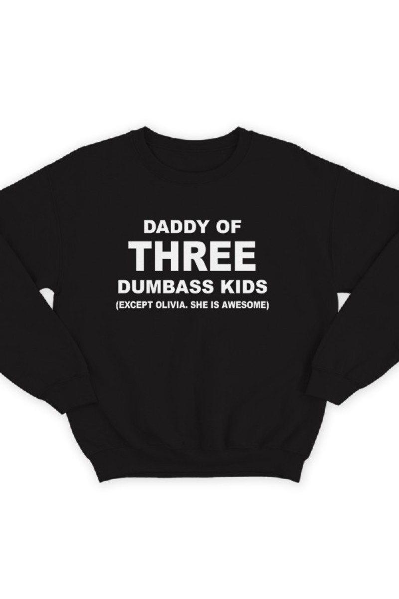 Толстовка без капюшона в подарок дл папы. "Daddy of three dumbass kids (Except Olivia. She is awesome)" - Папочка трех сорванцов (Кроме Оливии. Она клевая).